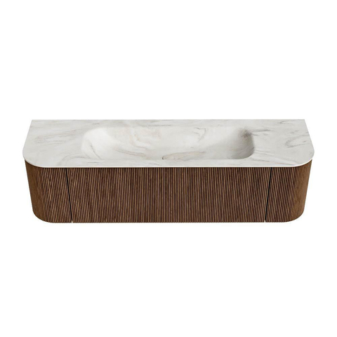 Het ultieme badmeubel dat je badkamer transformeert tot een oase van verfijning. Met zijn halfronde, verticale stroken van massief eiken, verkrijgbaar in de kleuren Oak en Walnut, straalt KURVE vakmanschap uit in elk detail. De zachte rondingen en slim ontworpen deurtjes, elk 40cm hoog, nodigen uit tot gebruik, terwijl de ruimte binnenin optimaal benut wordt dankzij de royale lade van dezelfde hoogte.