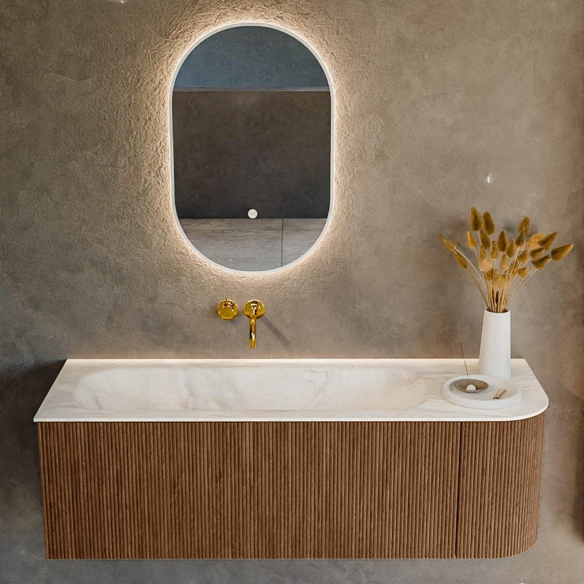 Het ultieme badmeubel dat je badkamer transformeert tot een oase van verfijning. Met zijn halfronde, verticale stroken van massief eiken, verkrijgbaar in de kleuren Oak en Walnut, straalt KURVE vakmanschap uit in elk detail. De zachte rondingen en slim ontworpen deurtjes, elk 40cm hoog, nodigen uit tot gebruik, terwijl de ruimte binnenin optimaal benut wordt dankzij de royale lade van dezelfde hoogte.