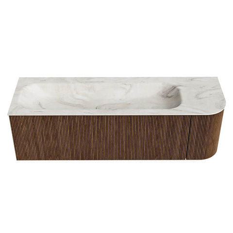 MONDIAZ KURVE-DLUX 145cm badmeubel met module 25 R kleur Walnut met 1 lade en 1 deur. Wastafel BIG LARGE links zonder kraangat kleur Ostra.