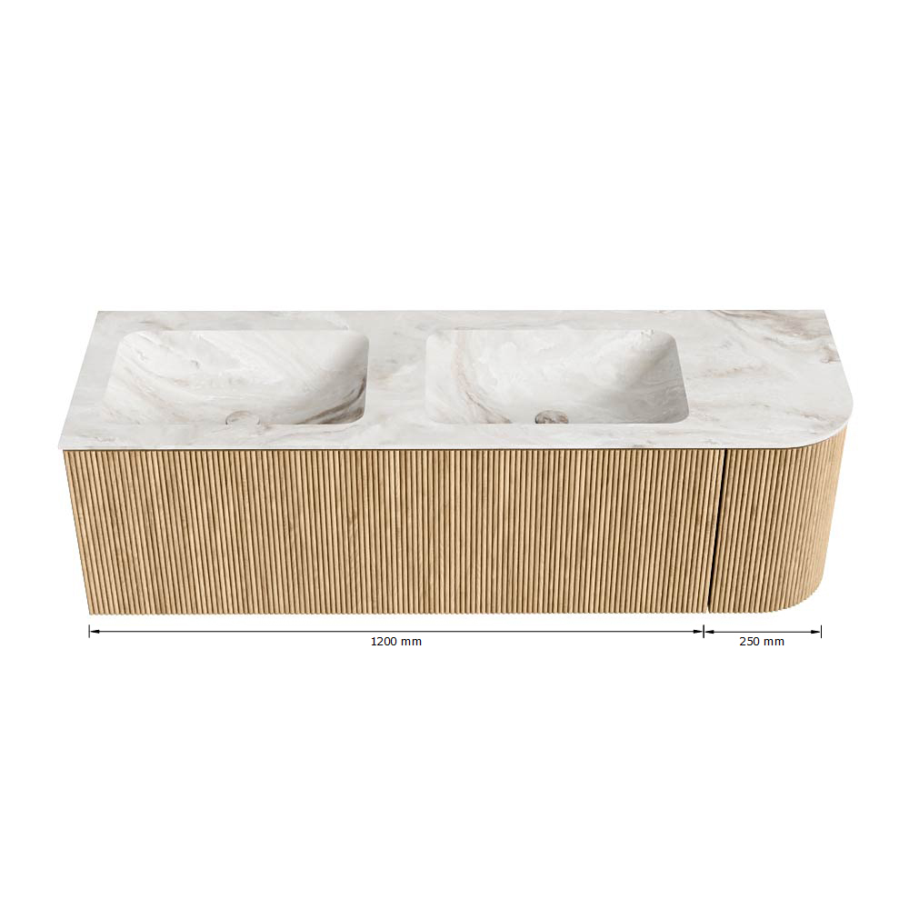 Het ultieme badmeubel dat je badkamer transformeert tot een oase van verfijning. Met zijn halfronde, verticale stroken van massief eiken, verkrijgbaar in de kleuren Oak en Walnut, straalt KURVE vakmanschap uit in elk detail. De zachte rondingen en slim ontworpen deurtjes, elk 40cm hoog, nodigen uit tot gebruik, terwijl de ruimte binnenin optimaal benut wordt dankzij de royale lade van dezelfde hoogte.