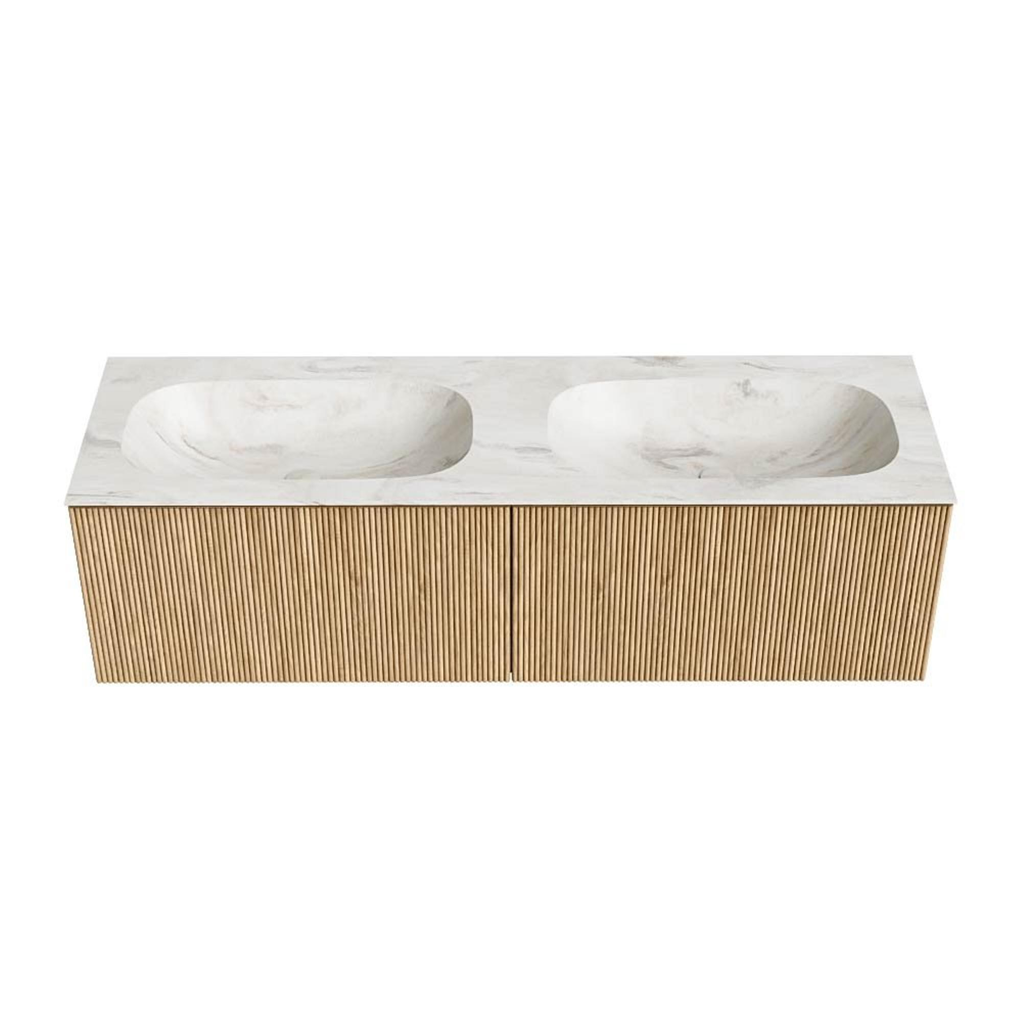 MONDIAZ KURVE-DLUX 150cm badmeubel kleur Oak met 2 lades. Wastafel STOR SMALL dubbel zonder kraangat kleur Ostra.