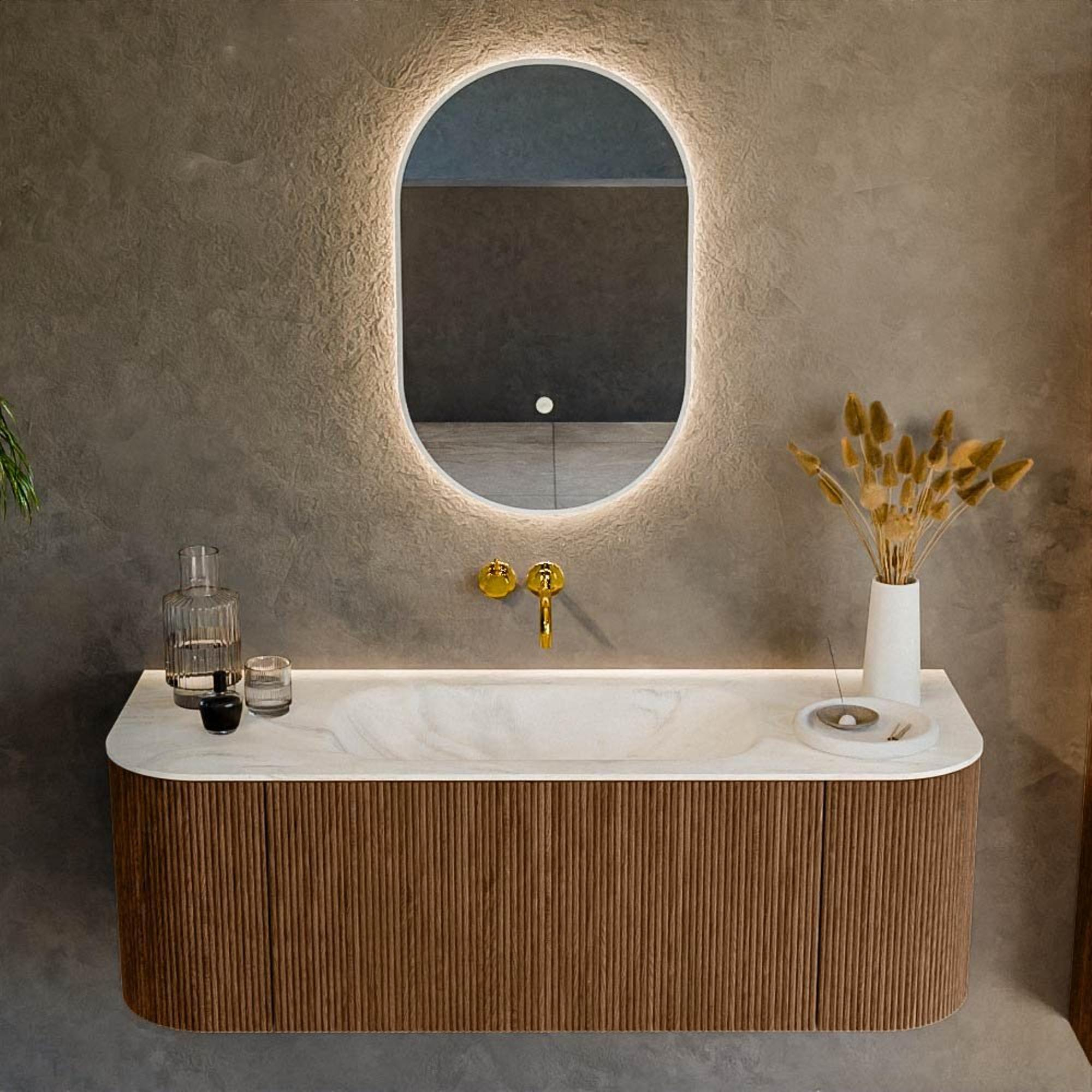 Het ultieme badmeubel dat je badkamer transformeert tot een oase van verfijning. Met zijn halfronde, verticale stroken van massief eiken, verkrijgbaar in de kleuren Oak en Walnut, straalt KURVE vakmanschap uit in elk detail. De zachte rondingen en slim ontworpen deurtjes, elk 40cm hoog, nodigen uit tot gebruik, terwijl de ruimte binnenin optimaal benut wordt dankzij de royale lade van dezelfde hoogte.