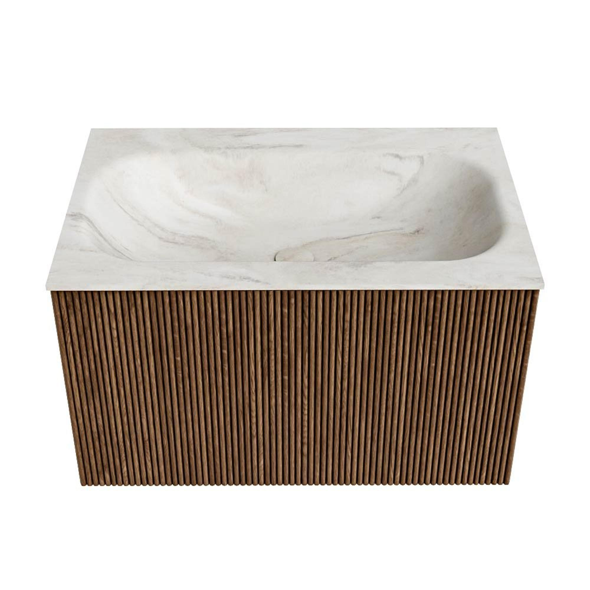 MONDIAZ KURVE-DLUX 70cm badmeubel kleur Walnut met 1 lade. Wastafel BIG SMALL midden zonder kraangat kleur Ostra.