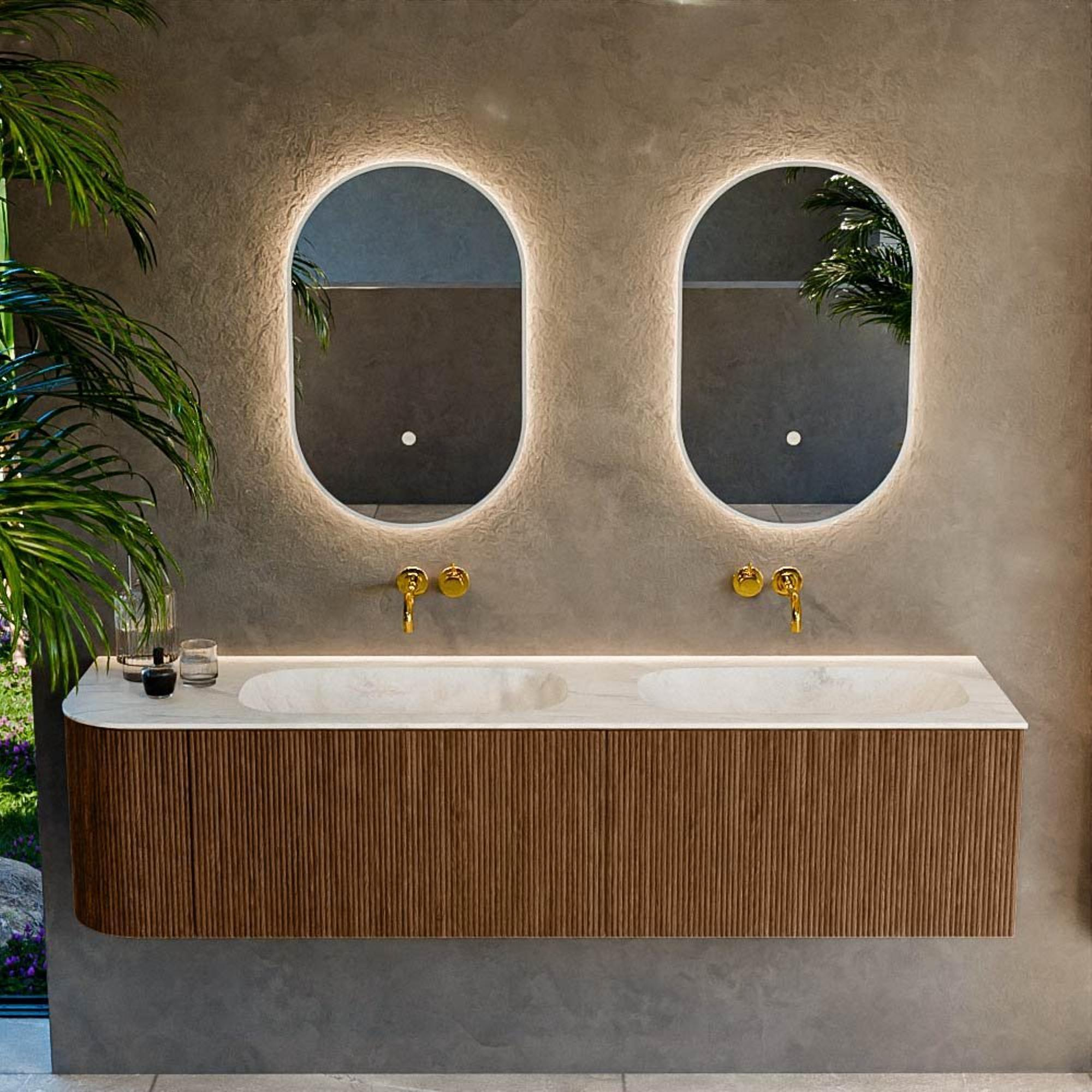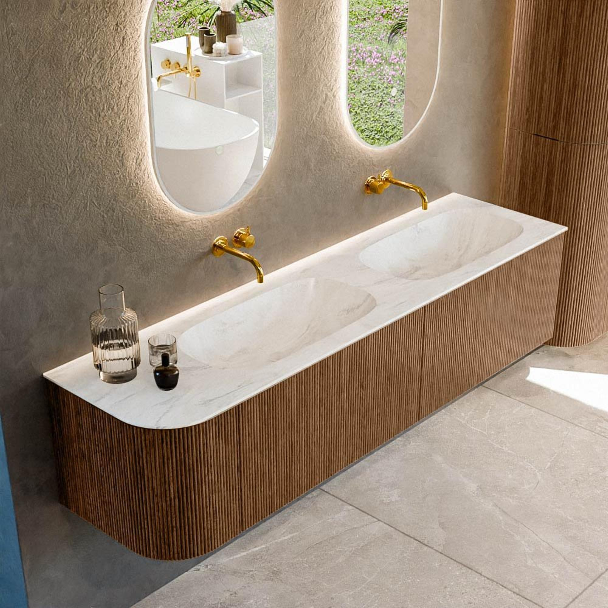 Het ultieme badmeubel dat je badkamer transformeert tot een oase van verfijning. Met zijn halfronde, verticale stroken van massief eiken, verkrijgbaar in de kleuren Oak en Walnut, straalt KURVE vakmanschap uit in elk detail. De zachte rondingen en slim ontworpen deurtjes, elk 40cm hoog, nodigen uit tot gebruik, terwijl de ruimte binnenin optimaal benut wordt dankzij de royale lade van dezelfde hoogte.