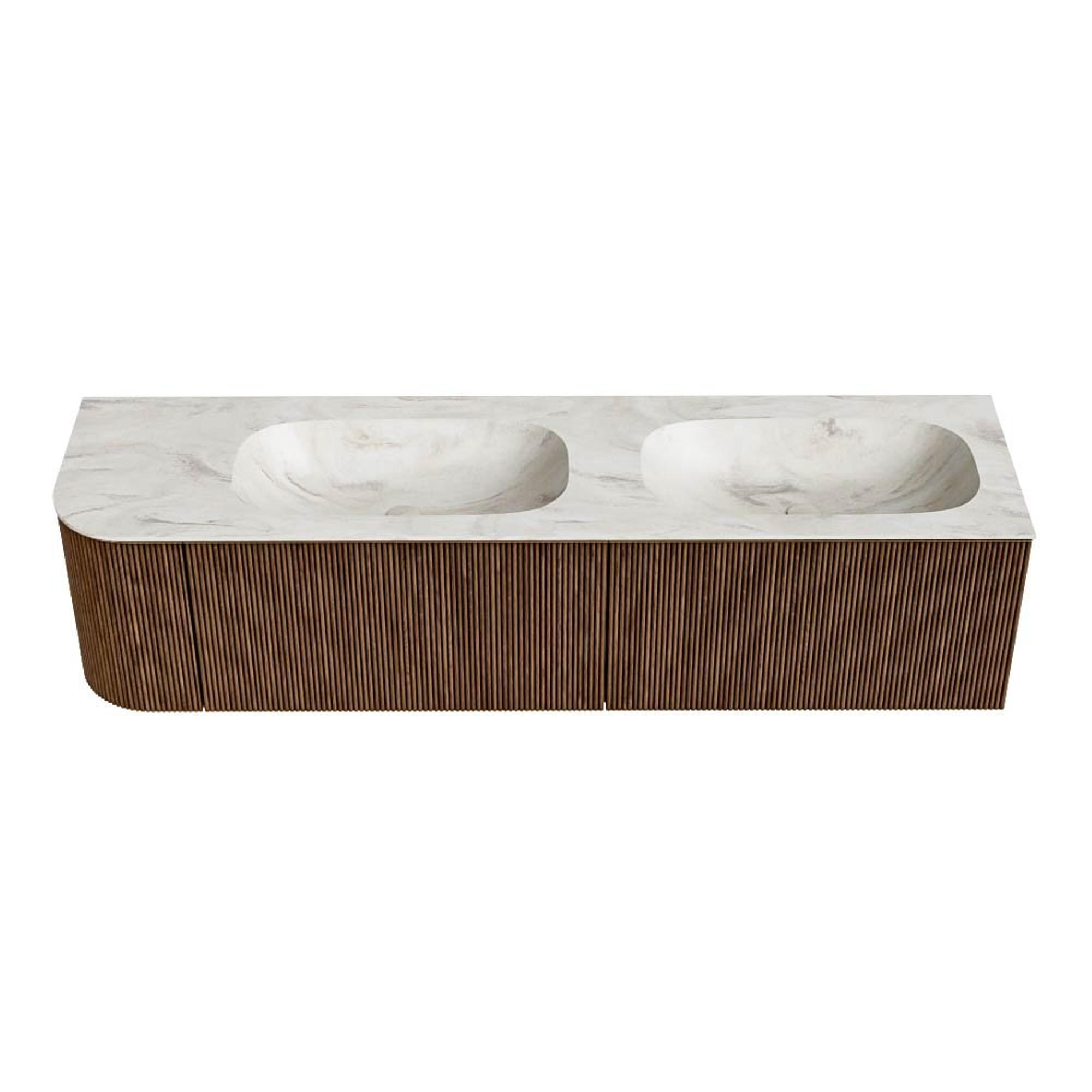 MONDIAZ KURVE-DLUX 175cm badmeubel met module 25 L kleur Walnut met 2 lades en 1 deur. Wastafel STOR SMALL dubbel / rechts zonder kraangat kleur Ostra.