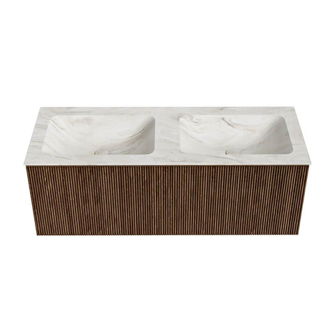MONDIAZ KURVE-DLUX 120cm badmeubel kleur Walnut met 1 lade. Wastafel LEAF dubbel zonder kraangat kleur Ostra.