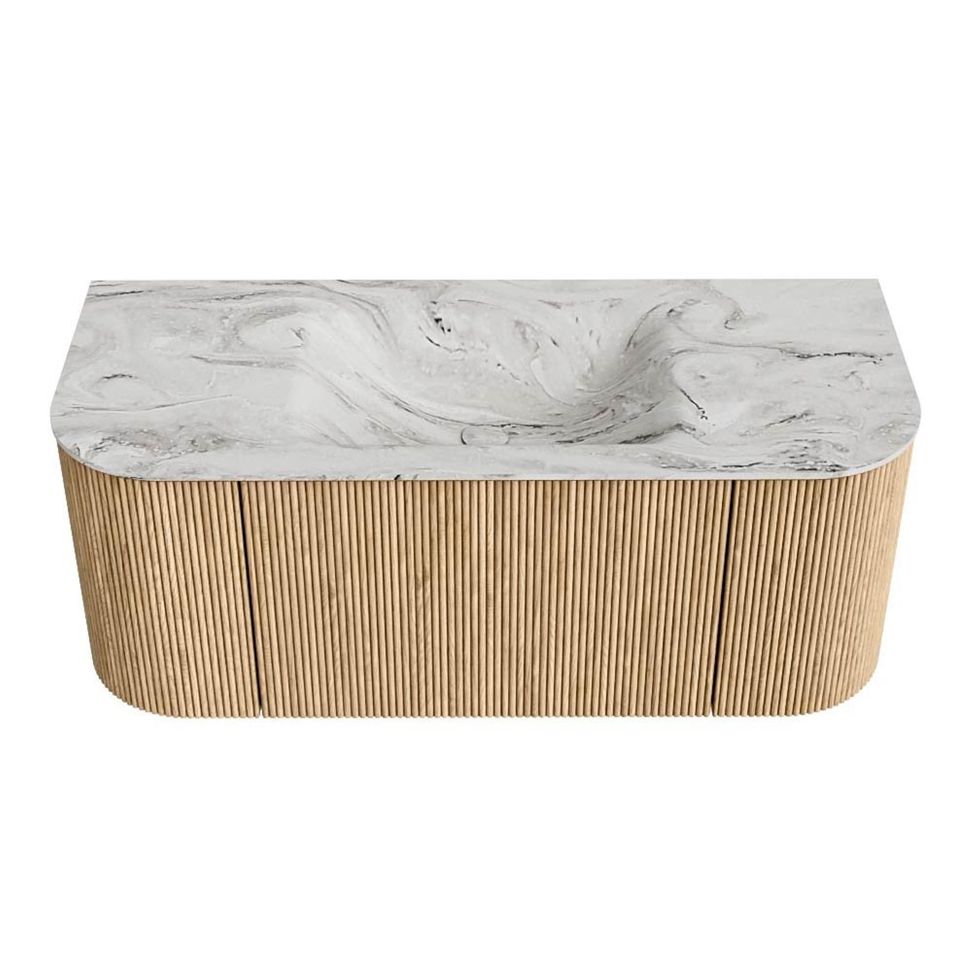 MONDIAZ KURVE-DLUX 110cm badmeubel met module 25 Len R kleur Oak met 1 lade en 2 deuren. Wastafel CLOUD midden zonder kraangat kleur Glace.