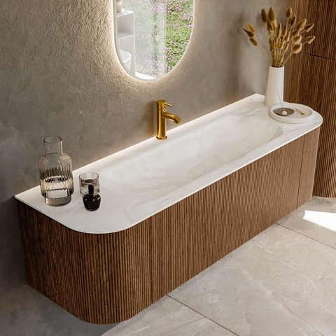Het ultieme badmeubel dat je badkamer transformeert tot een oase van verfijning. Met zijn halfronde, verticale stroken van massief eiken, verkrijgbaar in de kleuren Oak en Walnut, straalt KURVE vakmanschap uit in elk detail. De zachte rondingen en slim ontworpen deurtjes, elk 40cm hoog, nodigen uit tot gebruik, terwijl de ruimte binnenin optimaal benut wordt dankzij de royale lade van dezelfde hoogte.