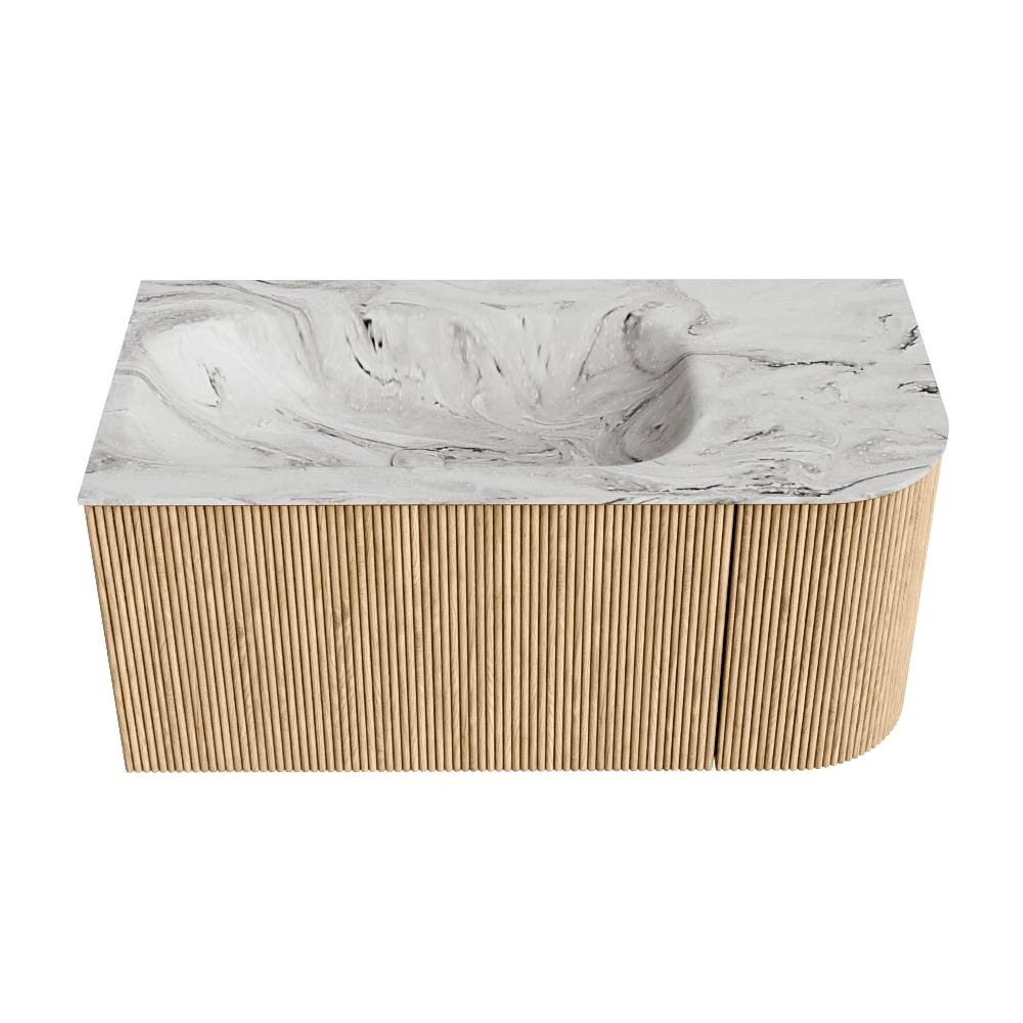 MONDIAZ KURVE-DLUX 95cm badmeubel met module 25 R kleur Oak met 1 lade en 1 deur. Wastafel BIG SMALL links zonder kraangat kleur Glace.