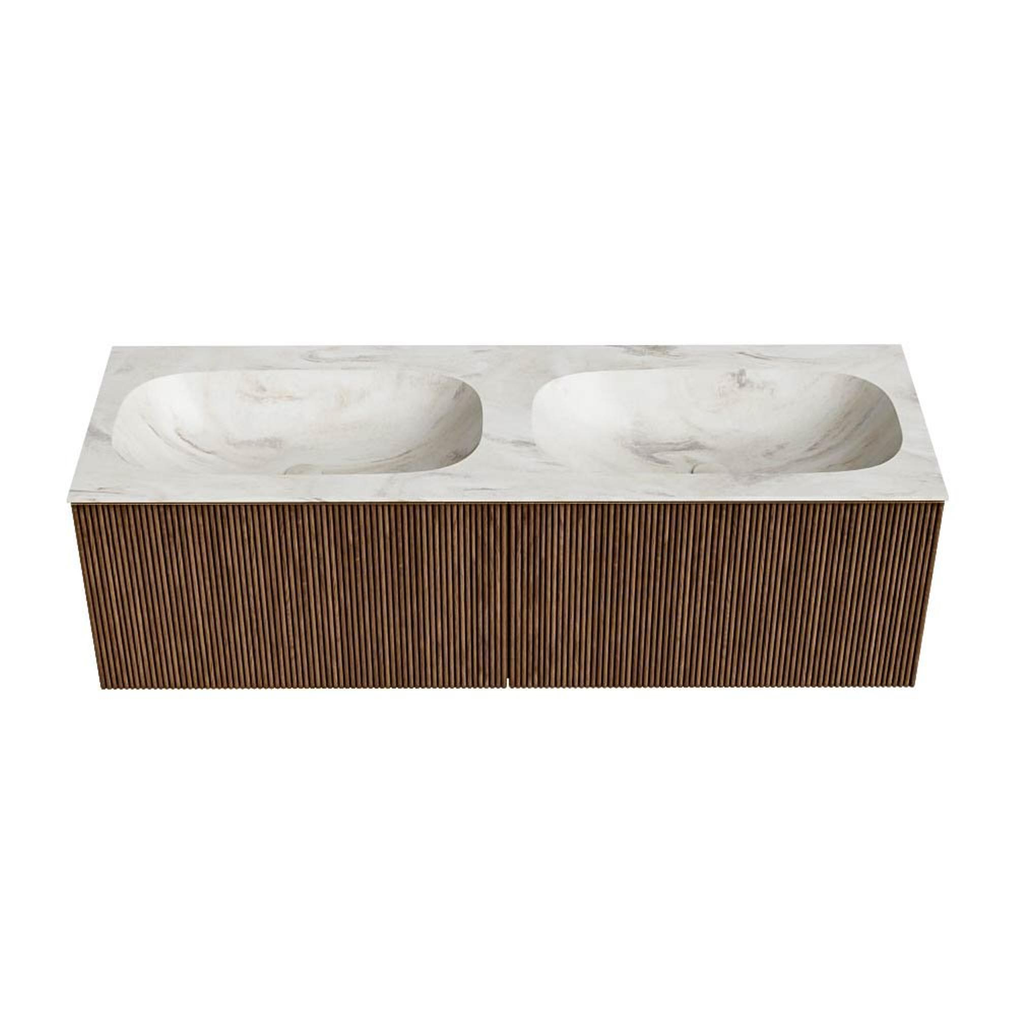 MONDIAZ KURVE-DLUX 140cm badmeubel kleur Walnut met 2 lades. Wastafel STOR SMALL dubbel 2 kraangaten kleur Ostra.