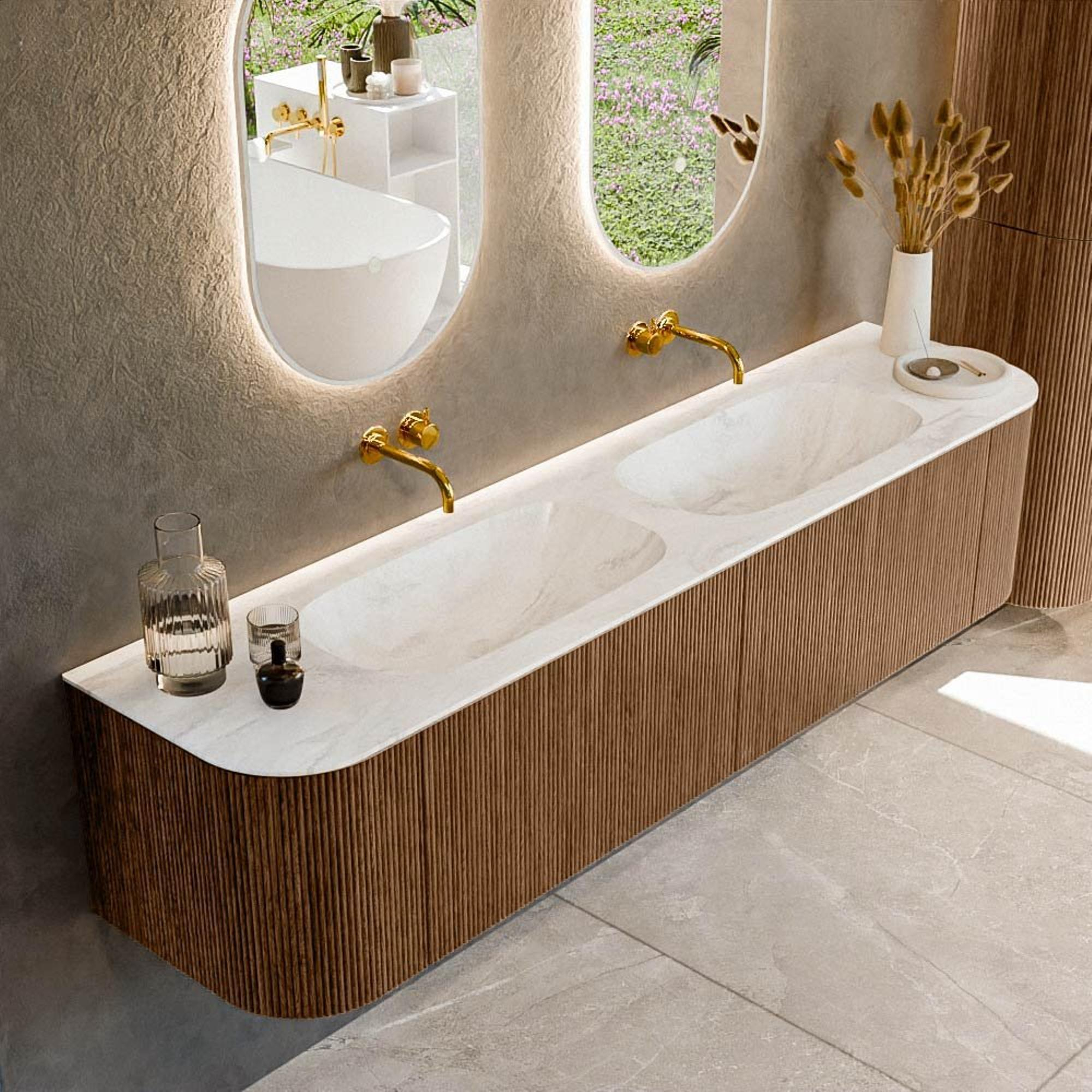 Het ultieme badmeubel dat je badkamer transformeert tot een oase van verfijning. Met zijn halfronde, verticale stroken van massief eiken, verkrijgbaar in de kleuren Oak en Walnut, straalt KURVE vakmanschap uit in elk detail. De zachte rondingen en slim ontworpen deurtjes, elk 40cm hoog, nodigen uit tot gebruik, terwijl de ruimte binnenin optimaal benut wordt dankzij de royale lade van dezelfde hoogte.