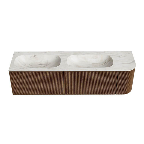 Het ultieme badmeubel dat je badkamer transformeert tot een oase van verfijning. Met zijn halfronde, verticale stroken van massief eiken, verkrijgbaar in de kleuren Oak en Walnut, straalt KURVE vakmanschap uit in elk detail. De zachte rondingen en slim ontworpen deurtjes, elk 40cm hoog, nodigen uit tot gebruik, terwijl de ruimte binnenin optimaal benut wordt dankzij de royale lade van dezelfde hoogte.