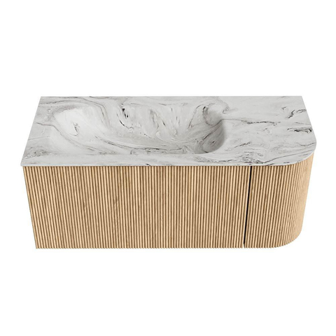 MONDIAZ KURVE-DLUX 105cm badmeubel met module 25 R kleur Oak met 1 lade en 1 deur. Wastafel BIG SMALL links zonder kraangat kleur Glace.