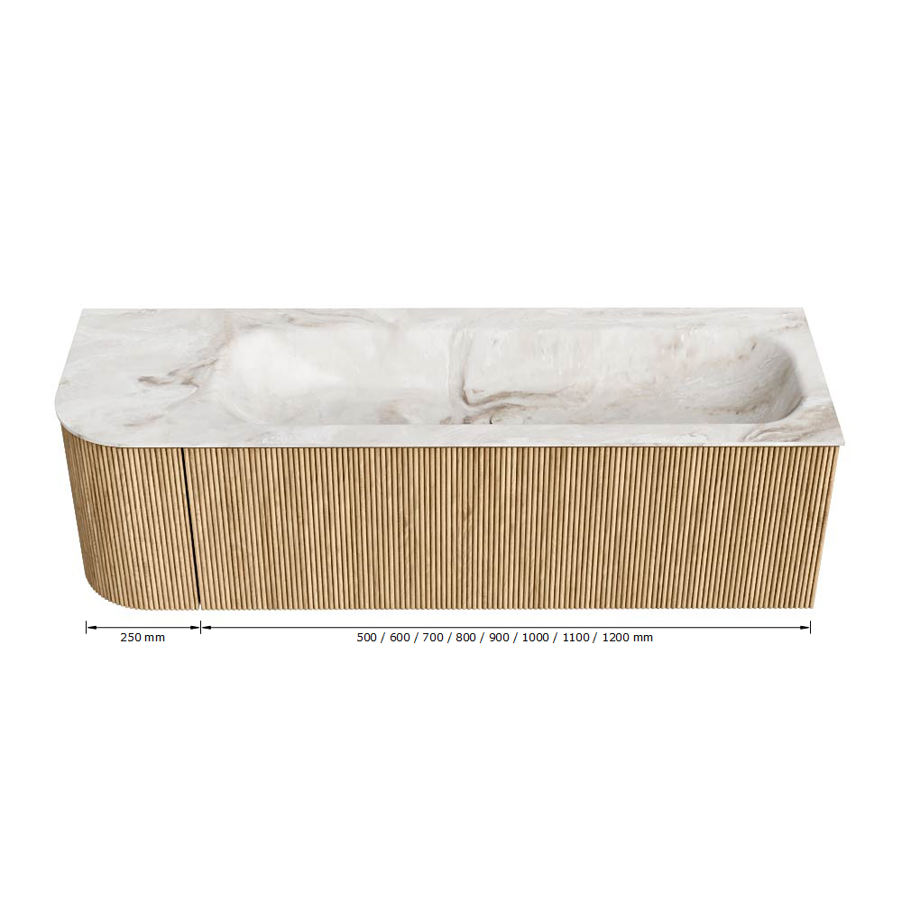 Het ultieme badmeubel dat je badkamer transformeert tot een oase van verfijning. Met zijn halfronde, verticale stroken van massief eiken, verkrijgbaar in de kleuren Oak en Walnut, straalt KURVE vakmanschap uit in elk detail. De zachte rondingen en slim ontworpen deurtjes, elk 40cm hoog, nodigen uit tot gebruik, terwijl de ruimte binnenin optimaal benut wordt dankzij de royale lade van dezelfde hoogte.