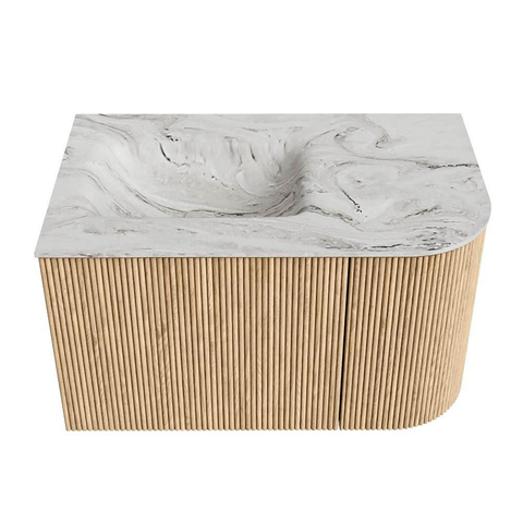 MONDIAZ KURVE-DLUX 75cm badmeubel met module 25 R kleur Oak met 1 lade en 1 deur. Wastafel GRUNNE links zonder kraangat kleur Glace.
