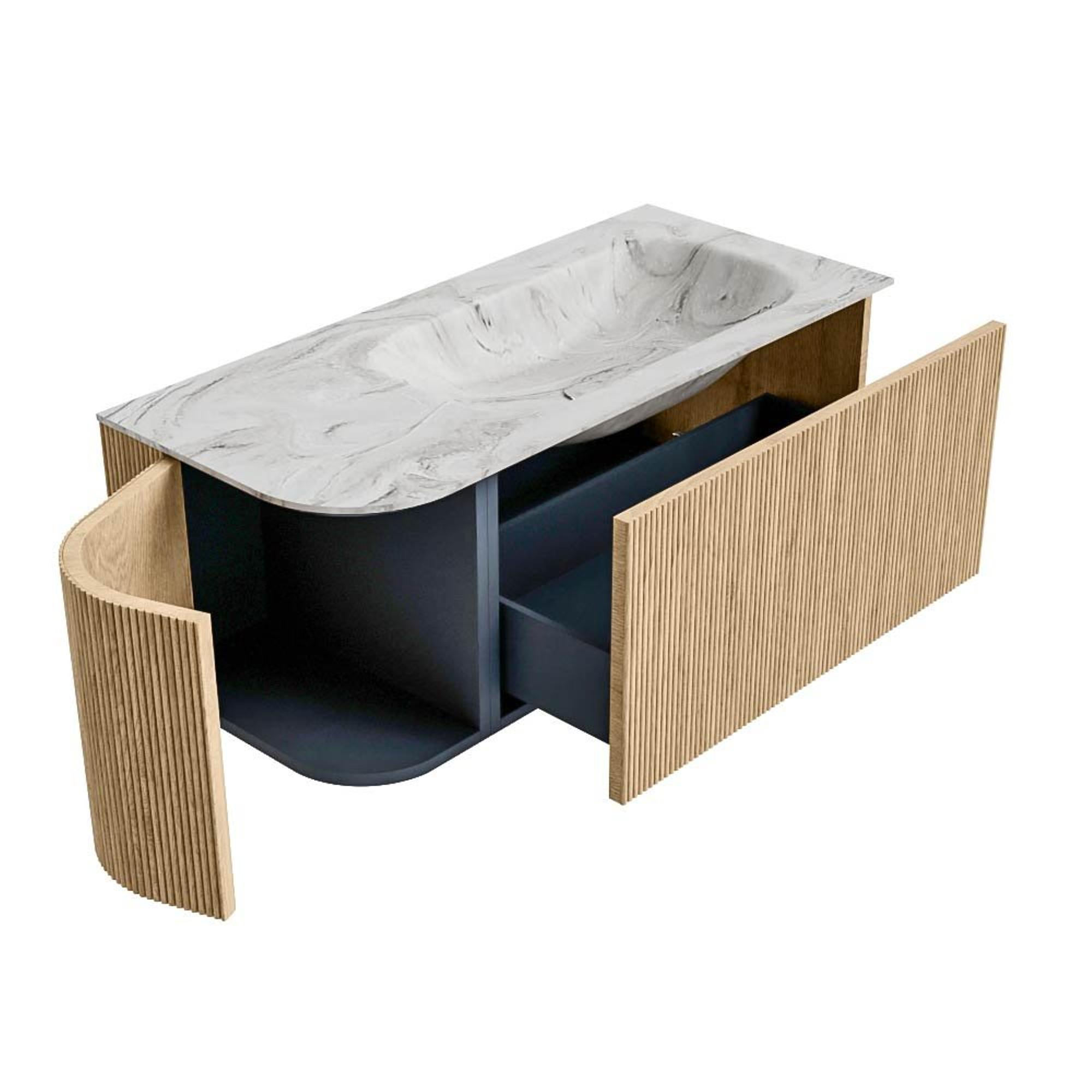 Het ultieme badmeubel dat je badkamer transformeert tot een oase van verfijning. Met zijn halfronde, verticale stroken van massief eiken, verkrijgbaar in de kleuren Oak en Walnut, straalt KURVE vakmanschap uit in elk detail. De zachte rondingen en slim ontworpen deurtjes, elk 40cm hoog, nodigen uit tot gebruik, terwijl de ruimte binnenin optimaal benut wordt dankzij de royale lade van dezelfde hoogte.