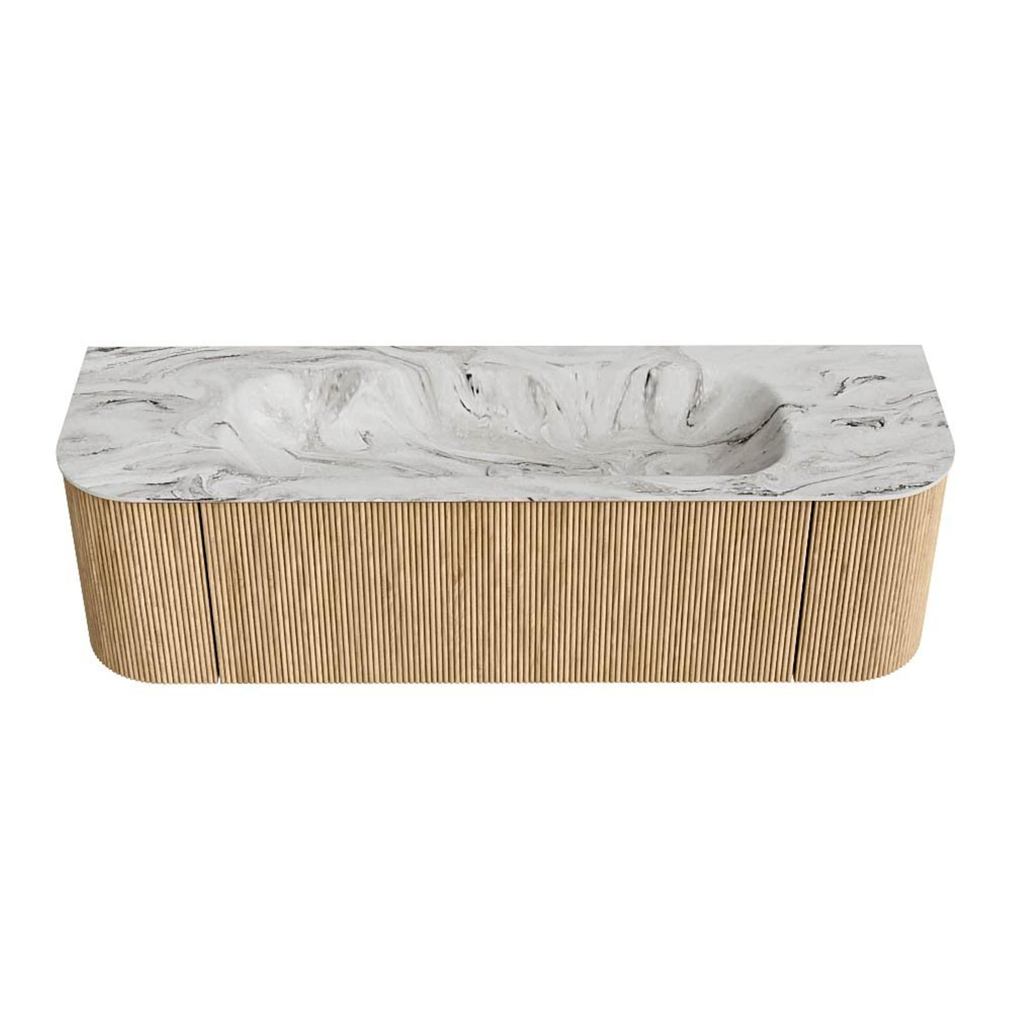 MONDIAZ KURVE-DLUX 150cm badmeubel met module 25 Len R kleur Oak met 1 lade en 2 deuren. Wastafel BIG MEDIUM midden zonder kraangat kleur Glace.