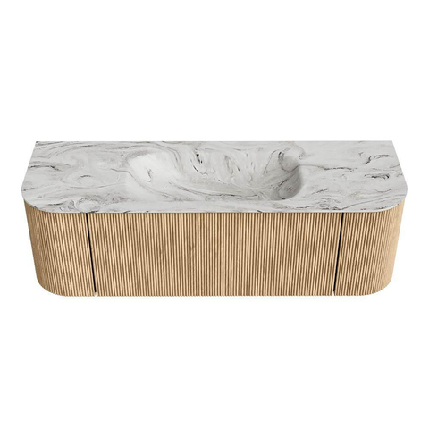 MONDIAZ KURVE-DLUX 140cm badmeubel met module 25 Len R kleur Oak met 1 lade en 2 deuren. Wastafel BIG SMALL midden zonder kraangat kleur Glace.
