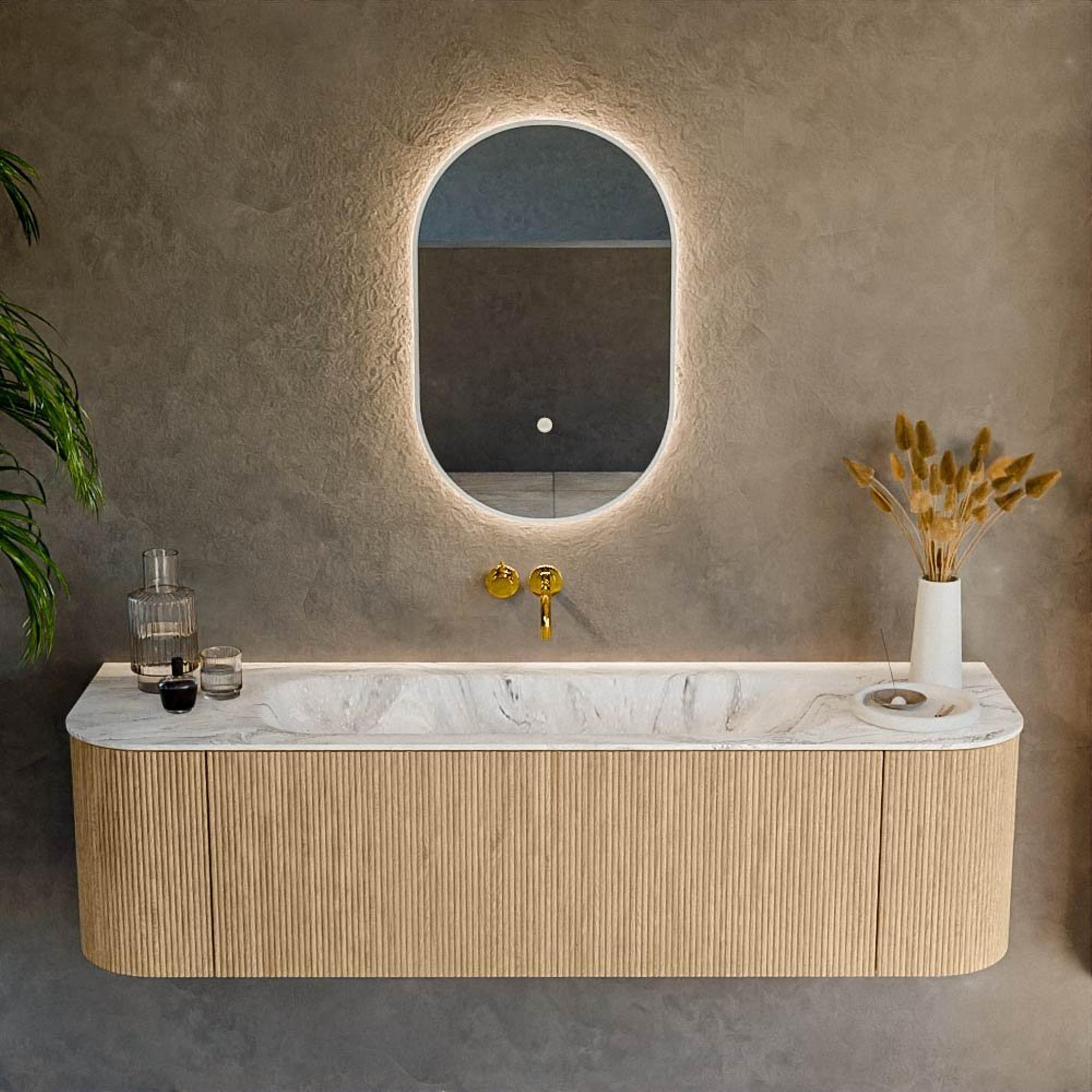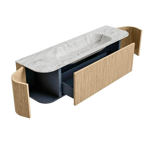 Het ultieme badmeubel dat je badkamer transformeert tot een oase van verfijning. Met zijn halfronde, verticale stroken van massief eiken, verkrijgbaar in de kleuren Oak en Walnut, straalt KURVE vakmanschap uit in elk detail. De zachte rondingen en slim ontworpen deurtjes, elk 40cm hoog, nodigen uit tot gebruik, terwijl de ruimte binnenin optimaal benut wordt dankzij de royale lade van dezelfde hoogte.
