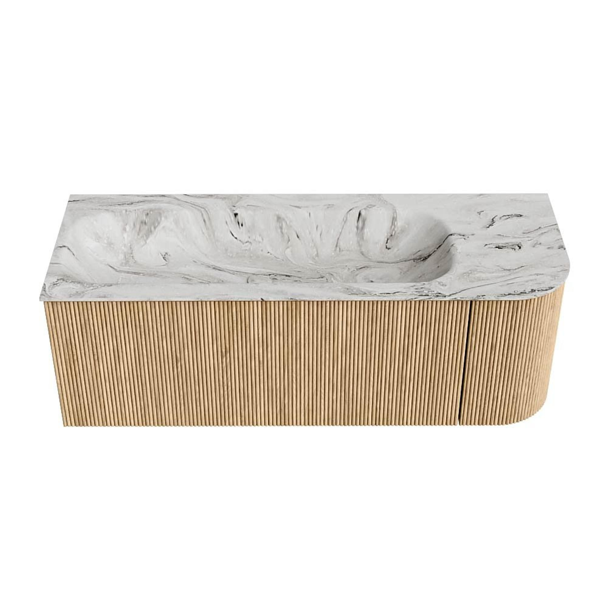 MONDIAZ KURVE-DLUX 125cm badmeubel met module 25 R kleur Oak met 1 lade en 1 deur. Wastafel BIG MEDIUM links zonder kraangat kleur Glace.
