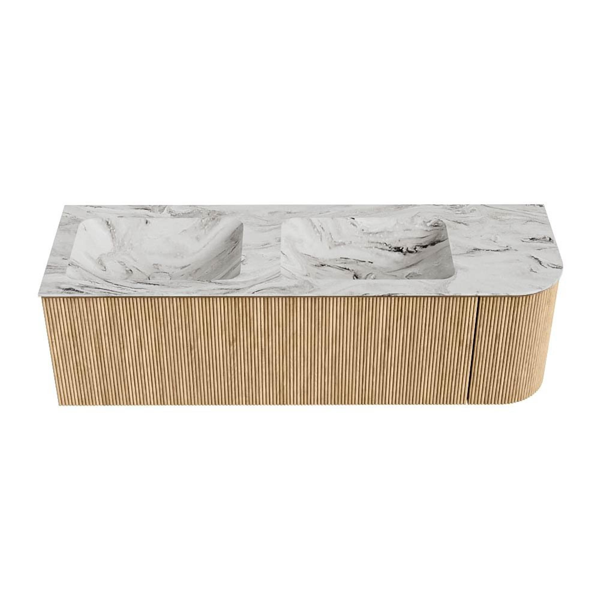 MONDIAZ KURVE-DLUX 145cm badmeubel met module 25 R kleur Oak met 1 lade en 1 deur. Wastafel LEAF dubbel / links zonder kraangat kleur Glace.