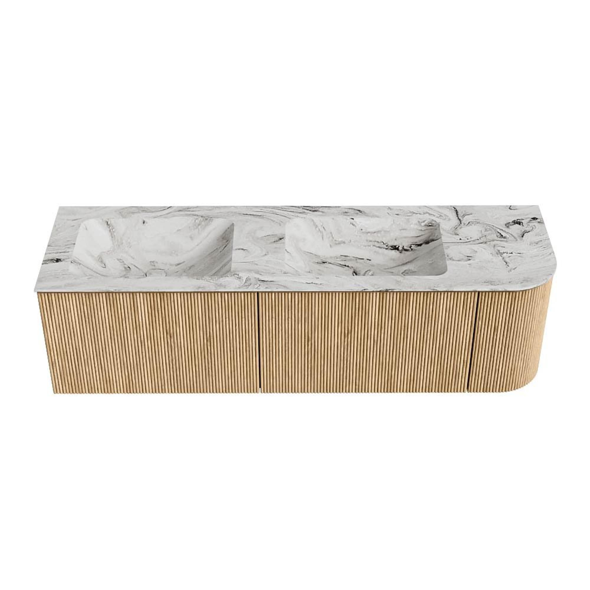 MONDIAZ KURVE-DLUX 155cm badmeubel met module 25 R kleur Oak met 2 lades en 1 deur. Wastafel LEAF dubbel / links 2 kraangaten kleur Glace.