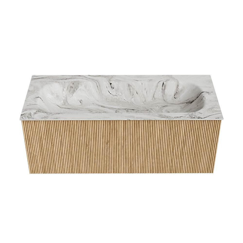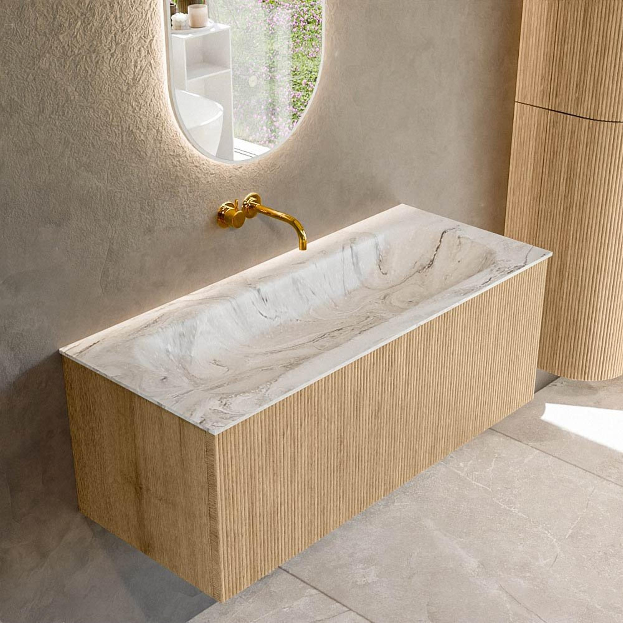 MONDIAZ KURVE-DLUX 110cm badmeubel kleur Oak met 1 lade. Wastafel BIG MEDIUM midden zonder kraangat kleur Glace.