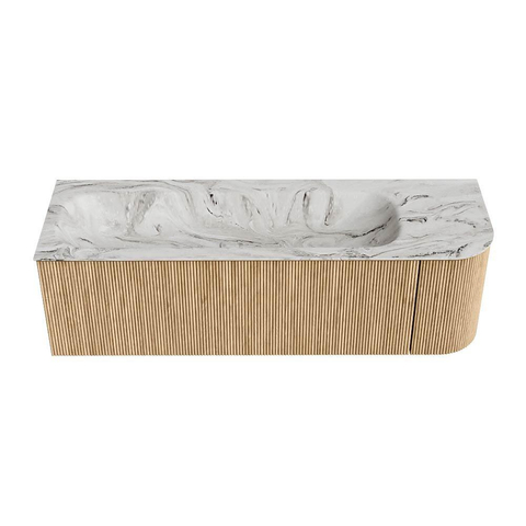 MONDIAZ KURVE-DLUX 145cm badmeubel met module 25 R kleur Oak met 1 lade en 1 deur. Wastafel BIG LARGE links 2 kraangaten kleur Glace.