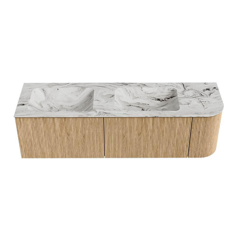 MONDIAZ KURVE-DLUX 155cm badmeubel met module 25 R kleur Oak met 2 lades en 1 deur. Wastafel LEAF dubbel / links zonder kraangat kleur Glace.