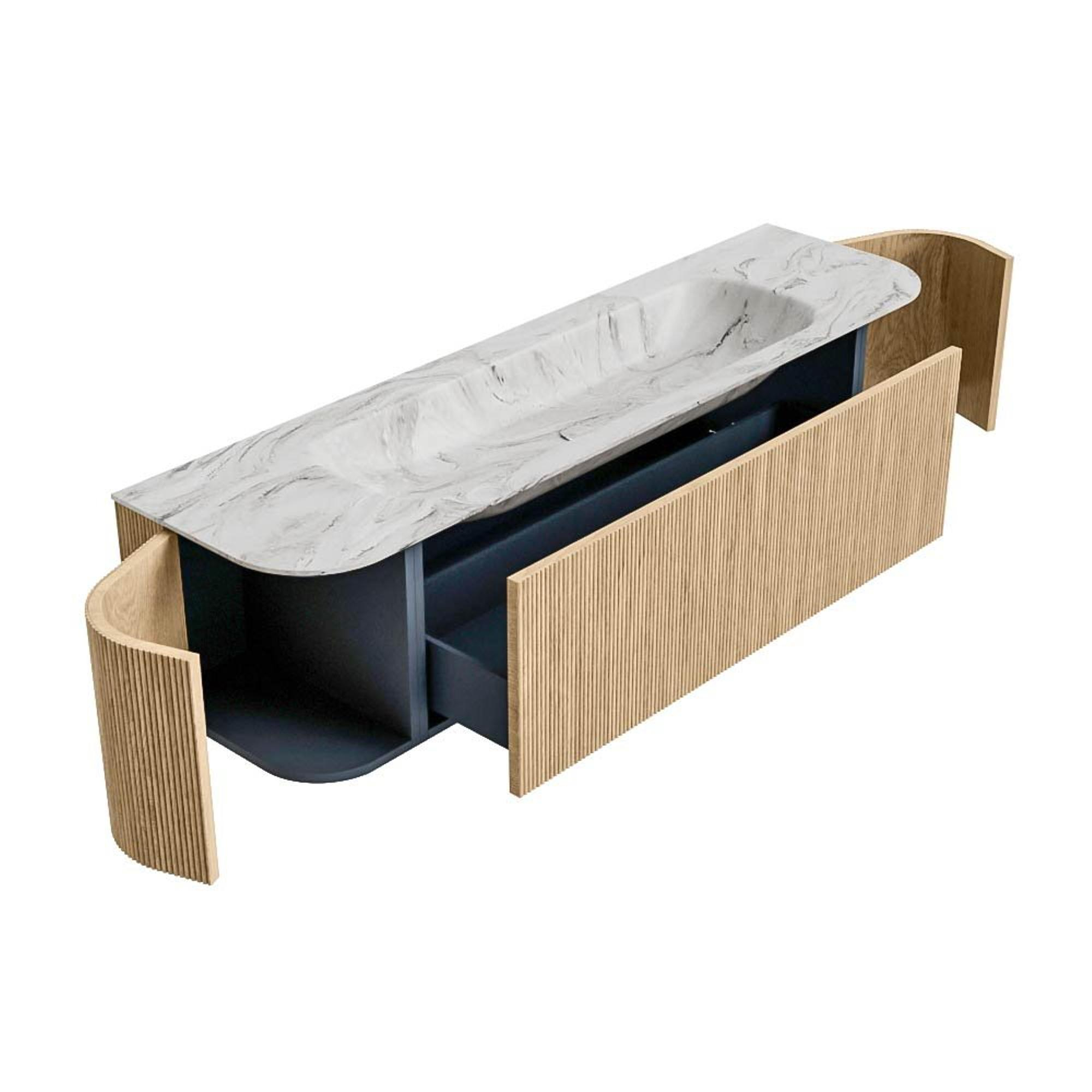 Het ultieme badmeubel dat je badkamer transformeert tot een oase van verfijning. Met zijn halfronde, verticale stroken van massief eiken, verkrijgbaar in de kleuren Oak en Walnut, straalt KURVE vakmanschap uit in elk detail. De zachte rondingen en slim ontworpen deurtjes, elk 40cm hoog, nodigen uit tot gebruik, terwijl de ruimte binnenin optimaal benut wordt dankzij de royale lade van dezelfde hoogte.