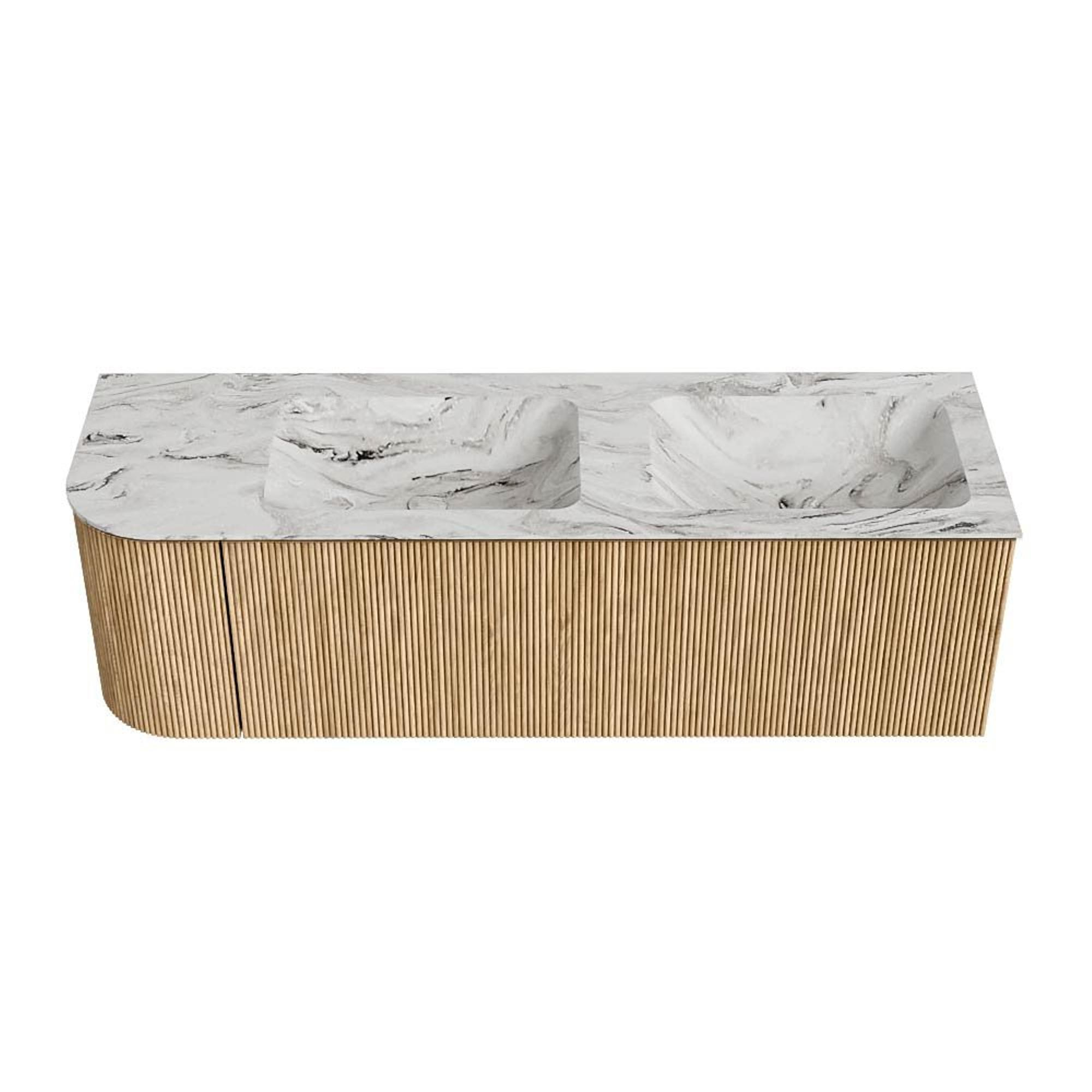 MONDIAZ KURVE-DLUX 145cm badmeubel met module 25 L kleur Oak met 1 lade en 1 deur. Wastafel LEAF dubbel / rechts zonder kraangat kleur Glace.