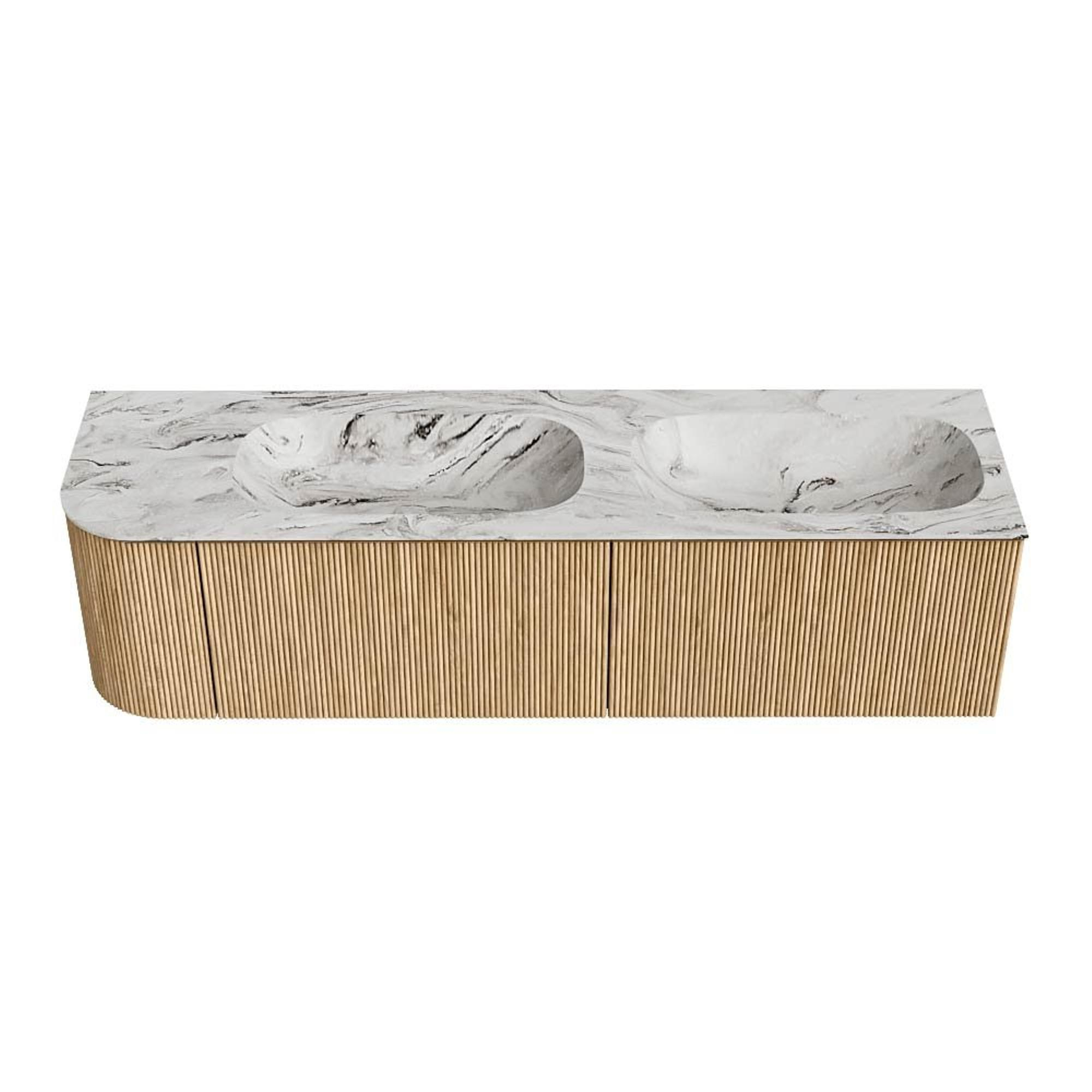 MONDIAZ KURVE-DLUX 165cm badmeubel met module 25 L kleur Oak met 2 lades en 1 deur. Wastafel STOR SMALL dubbel / rechts 2 kraangaten kleur Glace.
