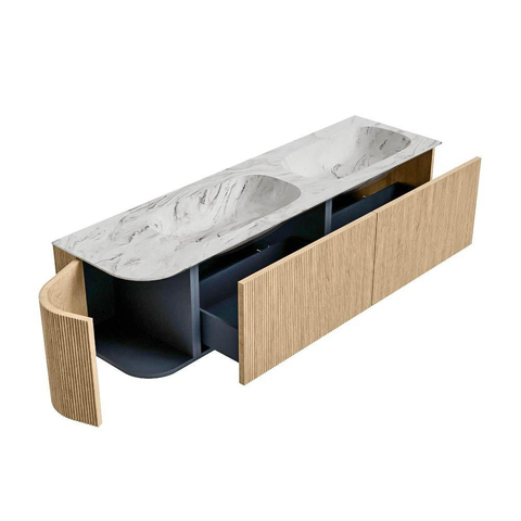 Het ultieme badmeubel dat je badkamer transformeert tot een oase van verfijning. Met zijn halfronde, verticale stroken van massief eiken, verkrijgbaar in de kleuren Oak en Walnut, straalt KURVE vakmanschap uit in elk detail. De zachte rondingen en slim ontworpen deurtjes, elk 40cm hoog, nodigen uit tot gebruik, terwijl de ruimte binnenin optimaal benut wordt dankzij de royale lade van dezelfde hoogte.