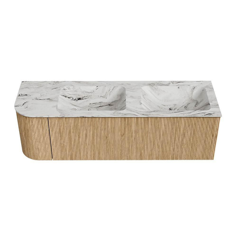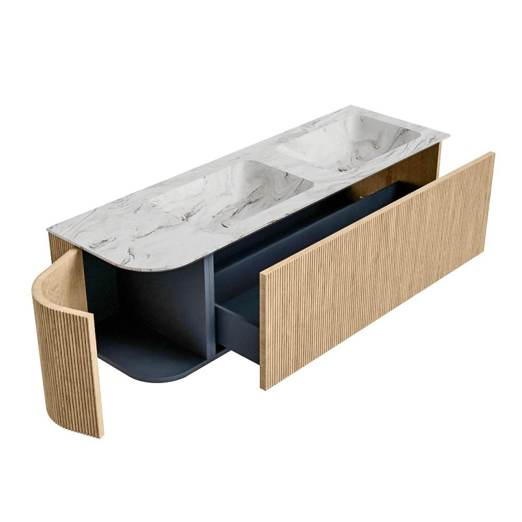 Het ultieme badmeubel dat je badkamer transformeert tot een oase van verfijning. Met zijn halfronde, verticale stroken van massief eiken, verkrijgbaar in de kleuren Oak en Walnut, straalt KURVE vakmanschap uit in elk detail. De zachte rondingen en slim ontworpen deurtjes, elk 40cm hoog, nodigen uit tot gebruik, terwijl de ruimte binnenin optimaal benut wordt dankzij de royale lade van dezelfde hoogte.