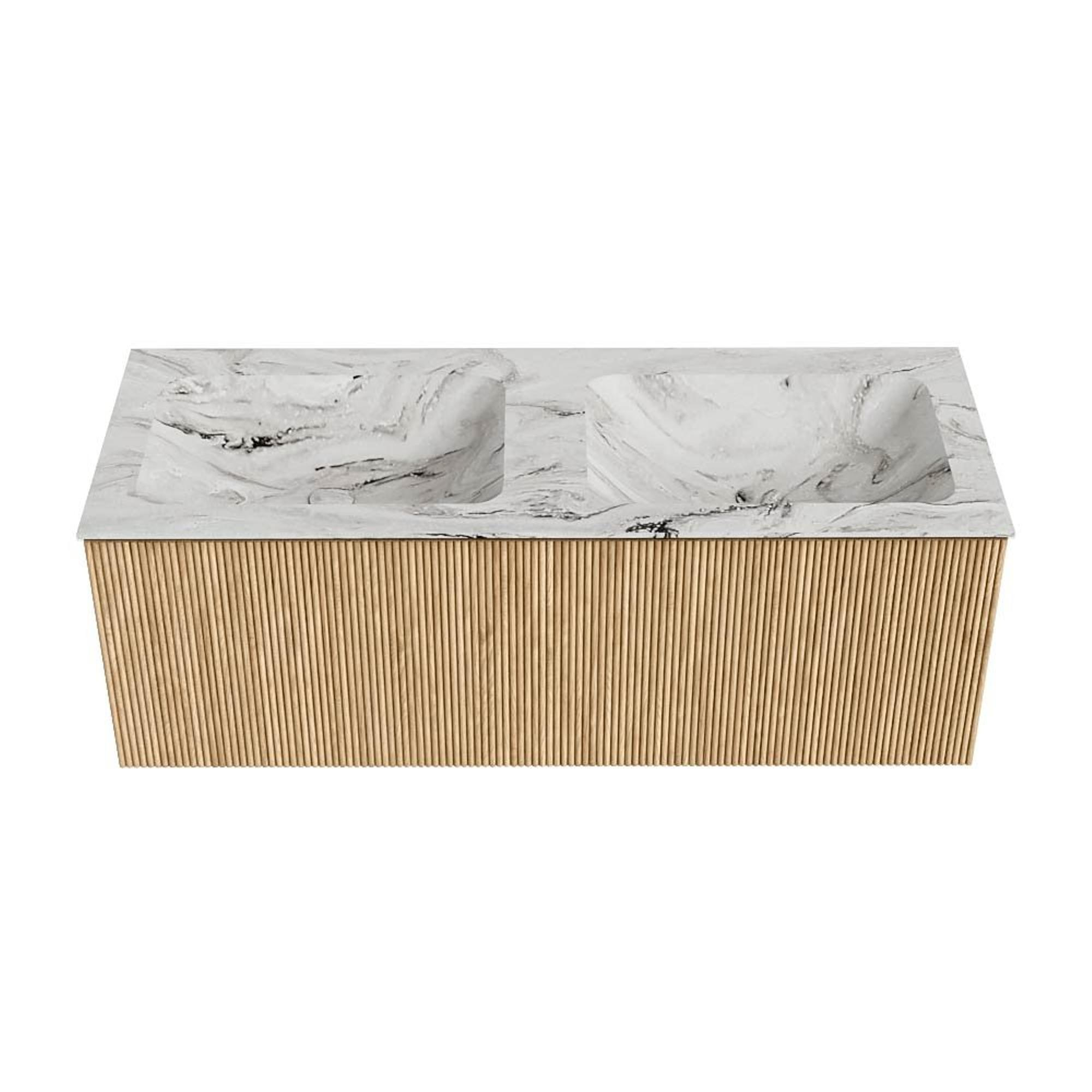 MONDIAZ KURVE-DLUX 120cm badmeubel kleur Oak met 1 lade. Wastafel LEAF dubbel 2 kraangaten kleur Glace.