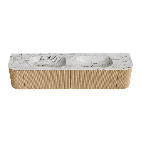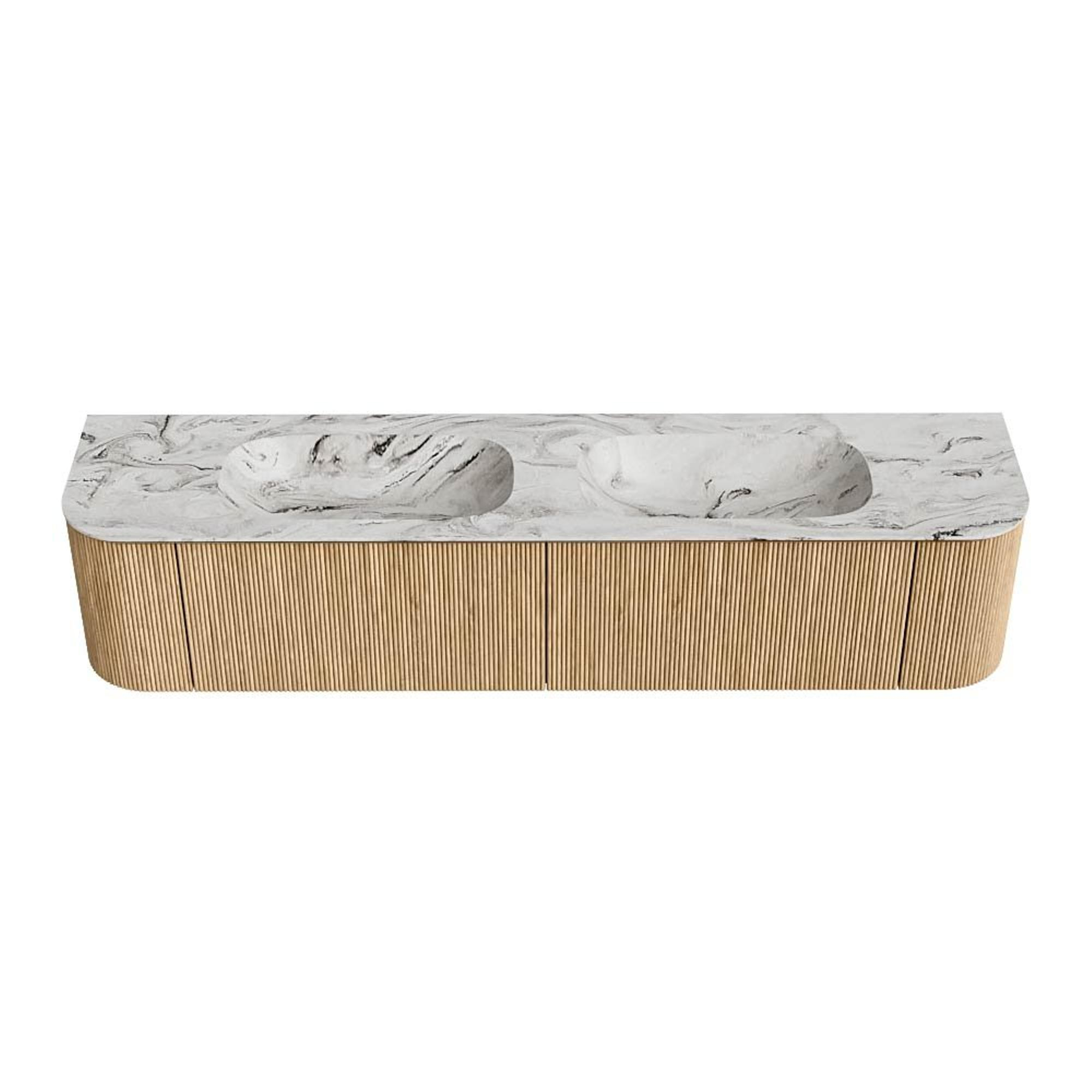 MONDIAZ KURVE-DLUX 200cm badmeubel met module 25 Len R kleur Oak met 2 lades en 2 deuren. Wastafel STOR SMALL dubbel zonder kraangat kleur Glace.