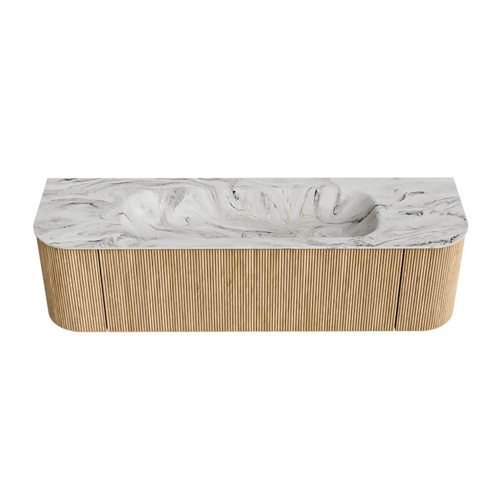 MONDIAZ KURVE-DLUX 160cm badmeubel met module 25 Len R kleur Oak met 1 lade en 2 deuren. Wastafel BIG MEDIUM midden 1 kraangat kleur Glace.