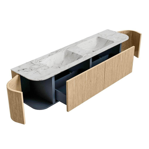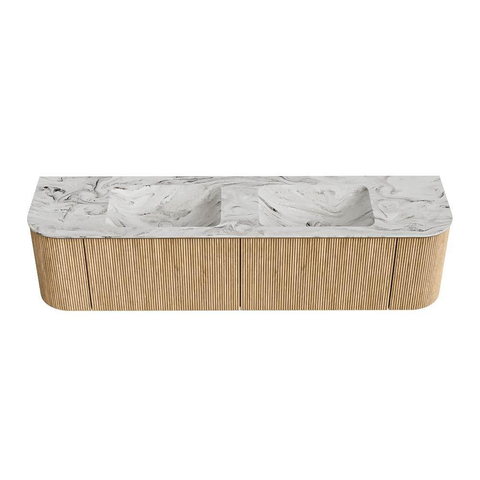 MONDIAZ KURVE-DLUX 180cm badmeubel met module 25 Len R kleur Oak met 2 lades en 2 deuren. Wastafel LEAF dubbel zonder kraangat kleur Glace.