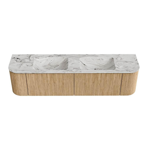 MONDIAZ KURVE-DLUX 180cm badmeubel met module 25 Len R kleur Oak met 2 lades en 2 deuren. Wastafel LEAF dubbel 2 kraangaten kleur Glace.
