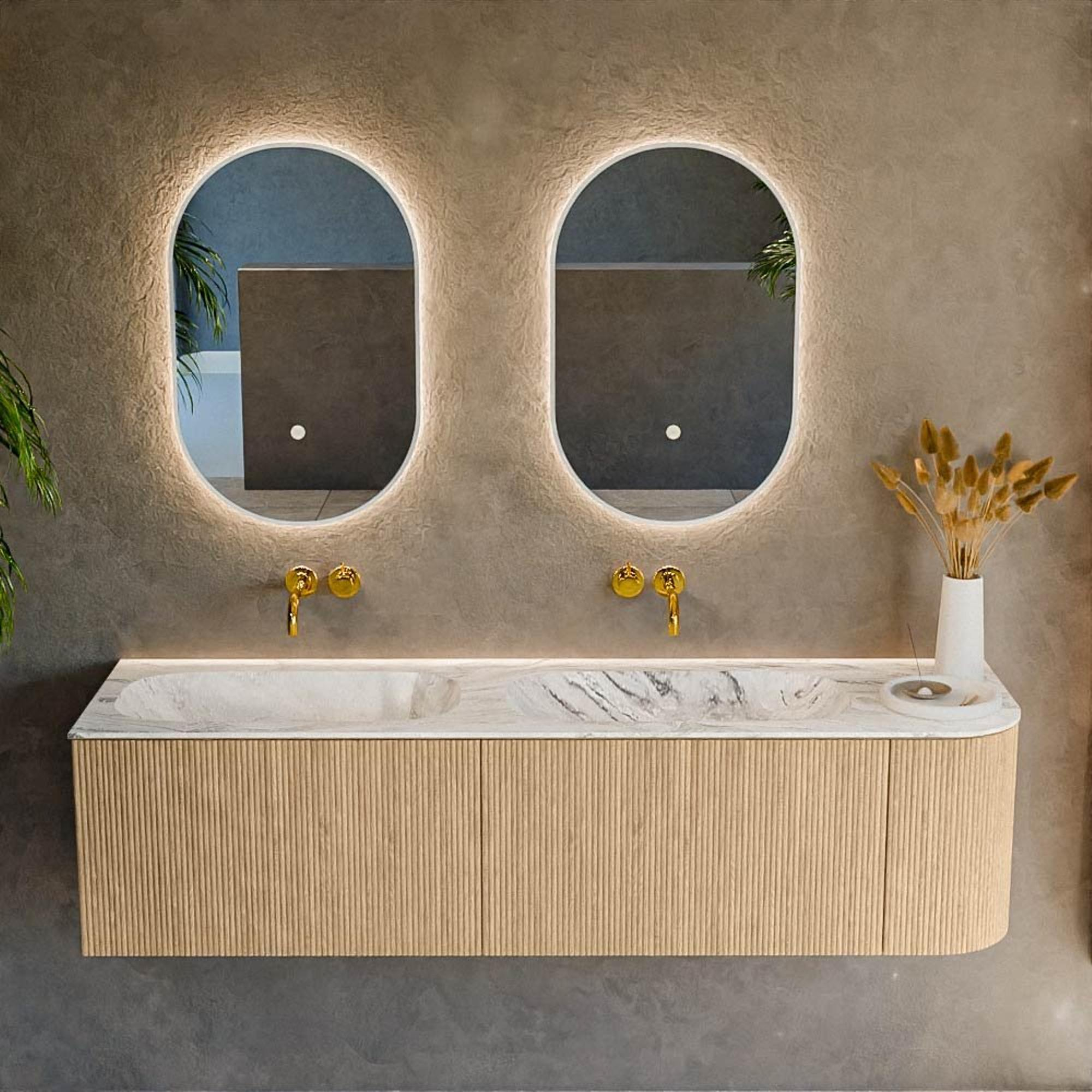Het ultieme badmeubel dat je badkamer transformeert tot een oase van verfijning. Met zijn halfronde, verticale stroken van massief eiken, verkrijgbaar in de kleuren Oak en Walnut, straalt KURVE vakmanschap uit in elk detail. De zachte rondingen en slim ontworpen deurtjes, elk 40cm hoog, nodigen uit tot gebruik, terwijl de ruimte binnenin optimaal benut wordt dankzij de royale lade van dezelfde hoogte.
