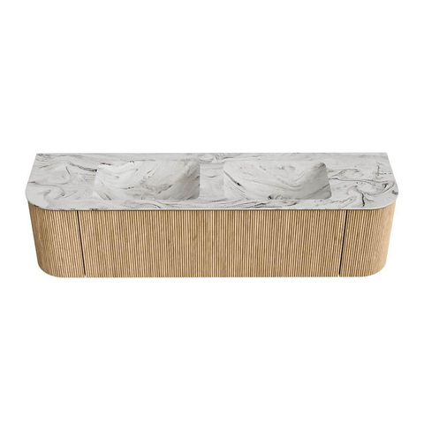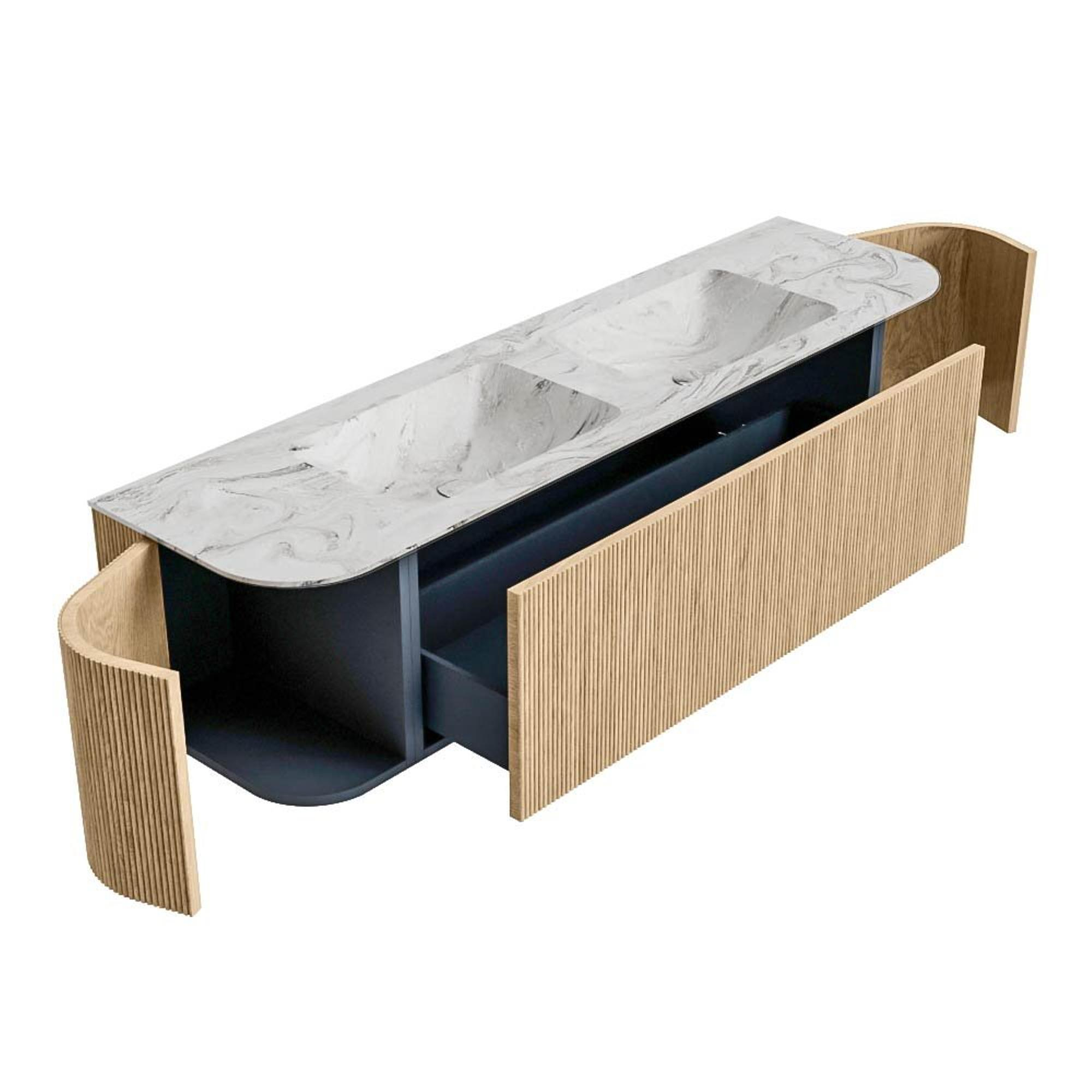 Het ultieme badmeubel dat je badkamer transformeert tot een oase van verfijning. Met zijn halfronde, verticale stroken van massief eiken, verkrijgbaar in de kleuren Oak en Walnut, straalt KURVE vakmanschap uit in elk detail. De zachte rondingen en slim ontworpen deurtjes, elk 40cm hoog, nodigen uit tot gebruik, terwijl de ruimte binnenin optimaal benut wordt dankzij de royale lade van dezelfde hoogte.