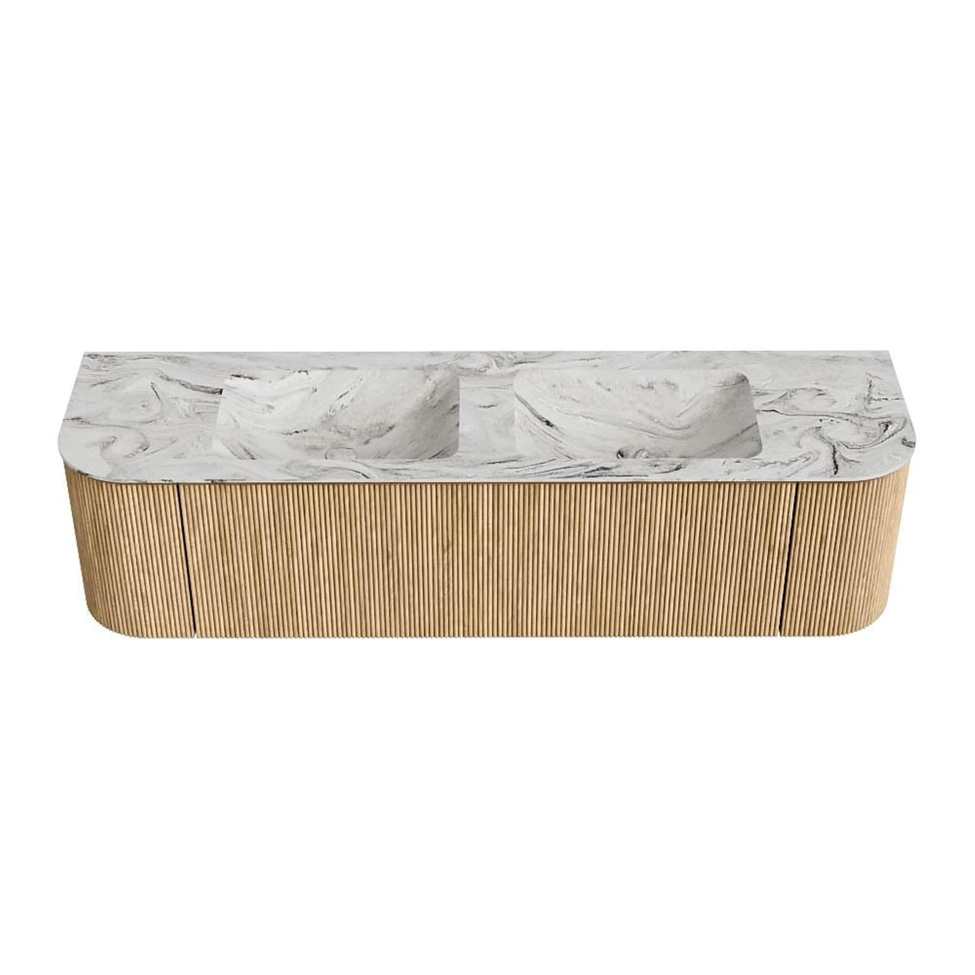 MONDIAZ KURVE-DLUX 170cm badmeubel met module 25 Len R kleur Oak met 1 lade en 2 deuren. Wastafel LEAF dubbel 2 kraangaten kleur Glace.