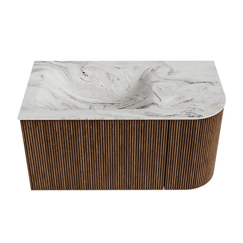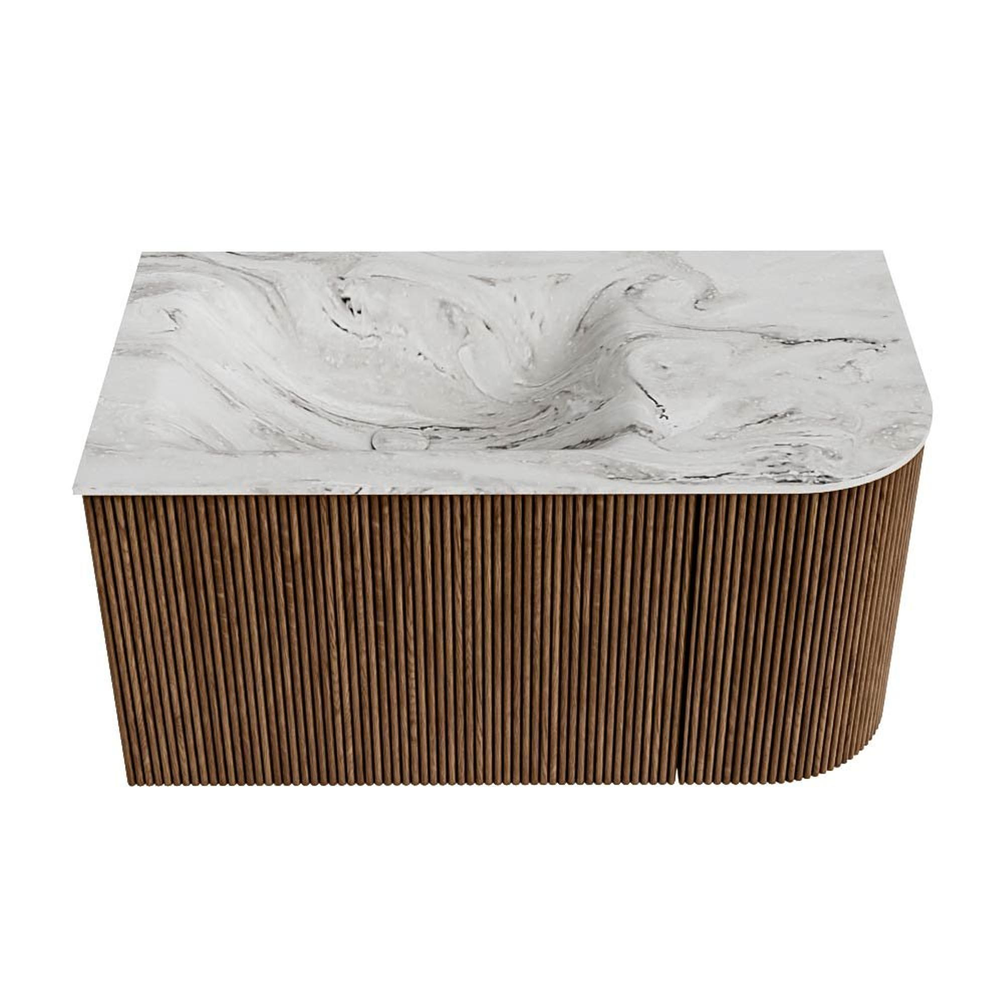 MONDIAZ KURVE-DLUX 85cm badmeubel met module 25 R kleur Walnut met 1 lade en 1 deur. Wastafel CLOUD links zonder kraangat kleur Glace.