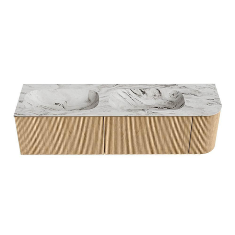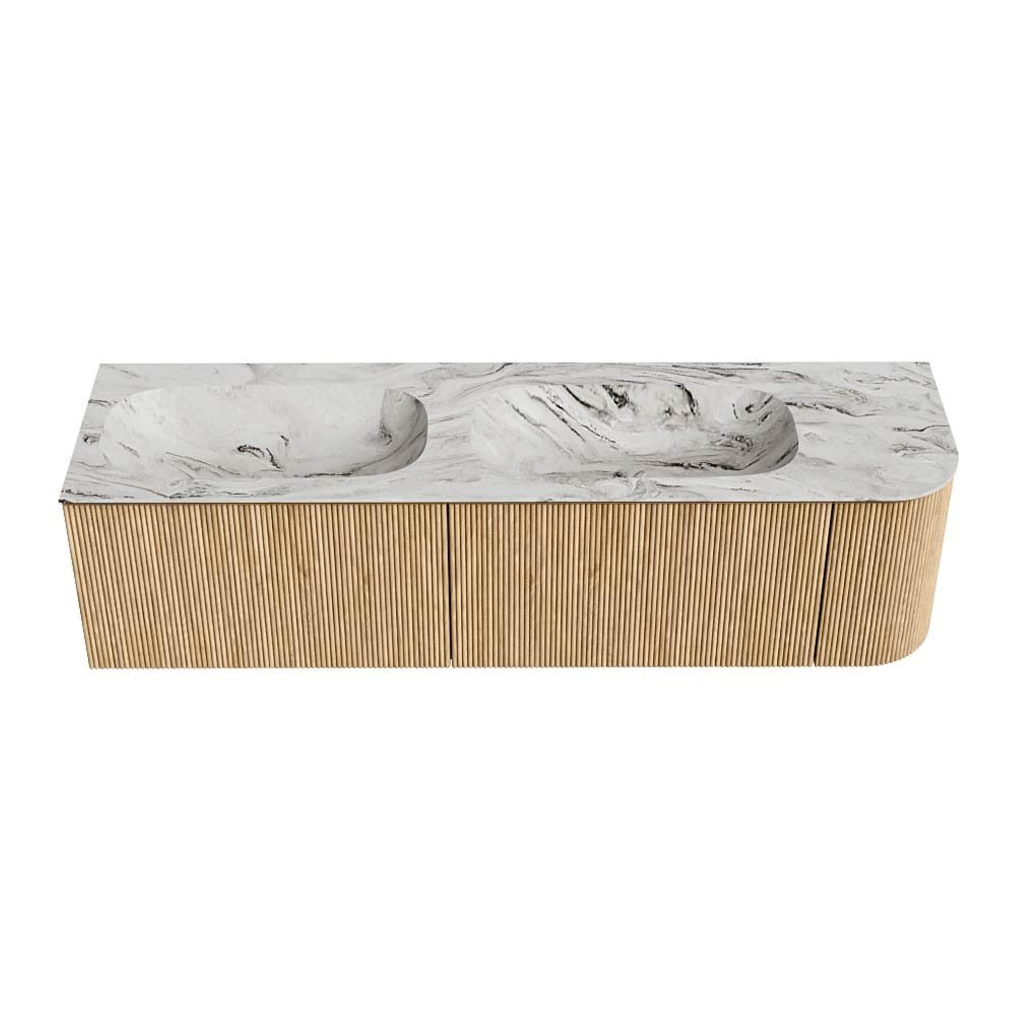 MONDIAZ KURVE-DLUX 165cm badmeubel met module 25 R kleur Oak met 2 lades en 1 deur. Wastafel STOR SMALL dubbel / links 2 kraangaten kleur Glace.