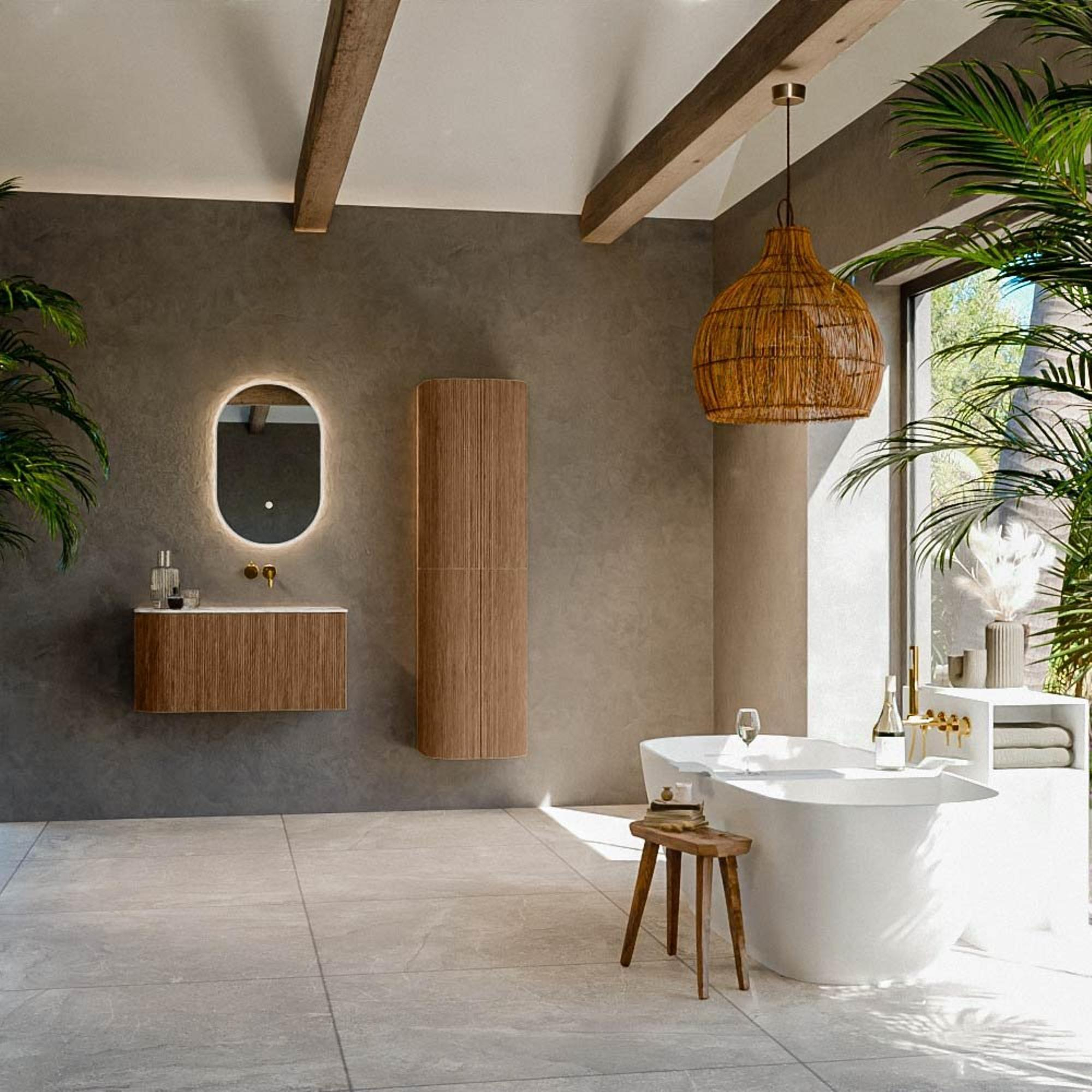 Het ultieme badmeubel dat je badkamer transformeert tot een oase van verfijning. Met zijn halfronde, verticale stroken van massief eiken, verkrijgbaar in de kleuren Oak en Walnut, straalt KURVE vakmanschap uit in elk detail. De zachte rondingen en slim ontworpen deurtjes, elk 40cm hoog, nodigen uit tot gebruik, terwijl de ruimte binnenin optimaal benut wordt dankzij de royale lade van dezelfde hoogte.
