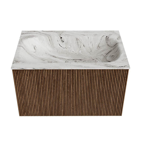 MONDIAZ KURVE-DLUX 70cm badmeubel kleur Walnut met 1 lade. Wastafel BIG SMALL midden zonder kraangat kleur Glace.