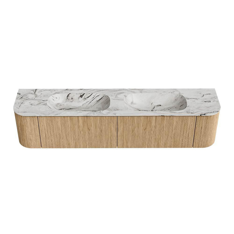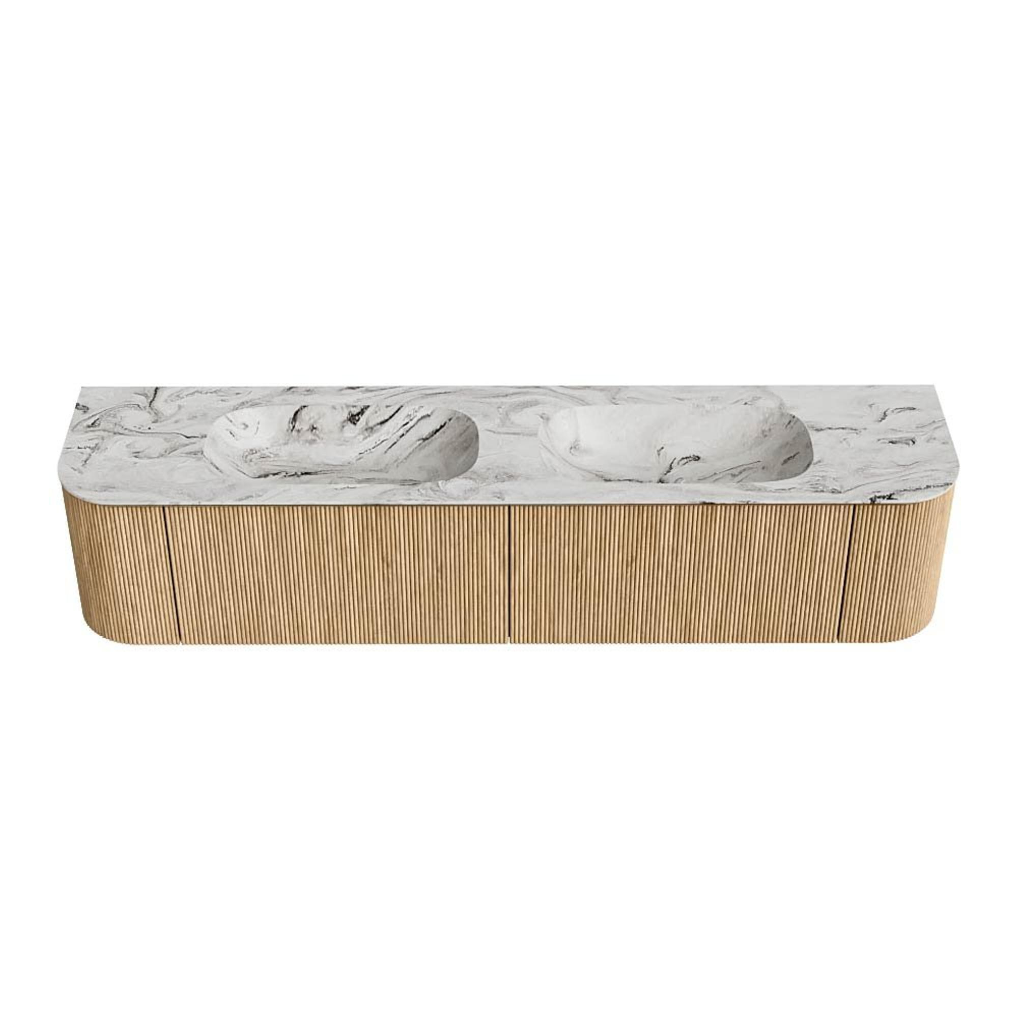 MONDIAZ KURVE-DLUX 200cm badmeubel met module 25 Len R kleur Oak met 2 lades en 2 deuren. Wastafel STOR SMALL dubbel 2 kraangaten kleur Glace.