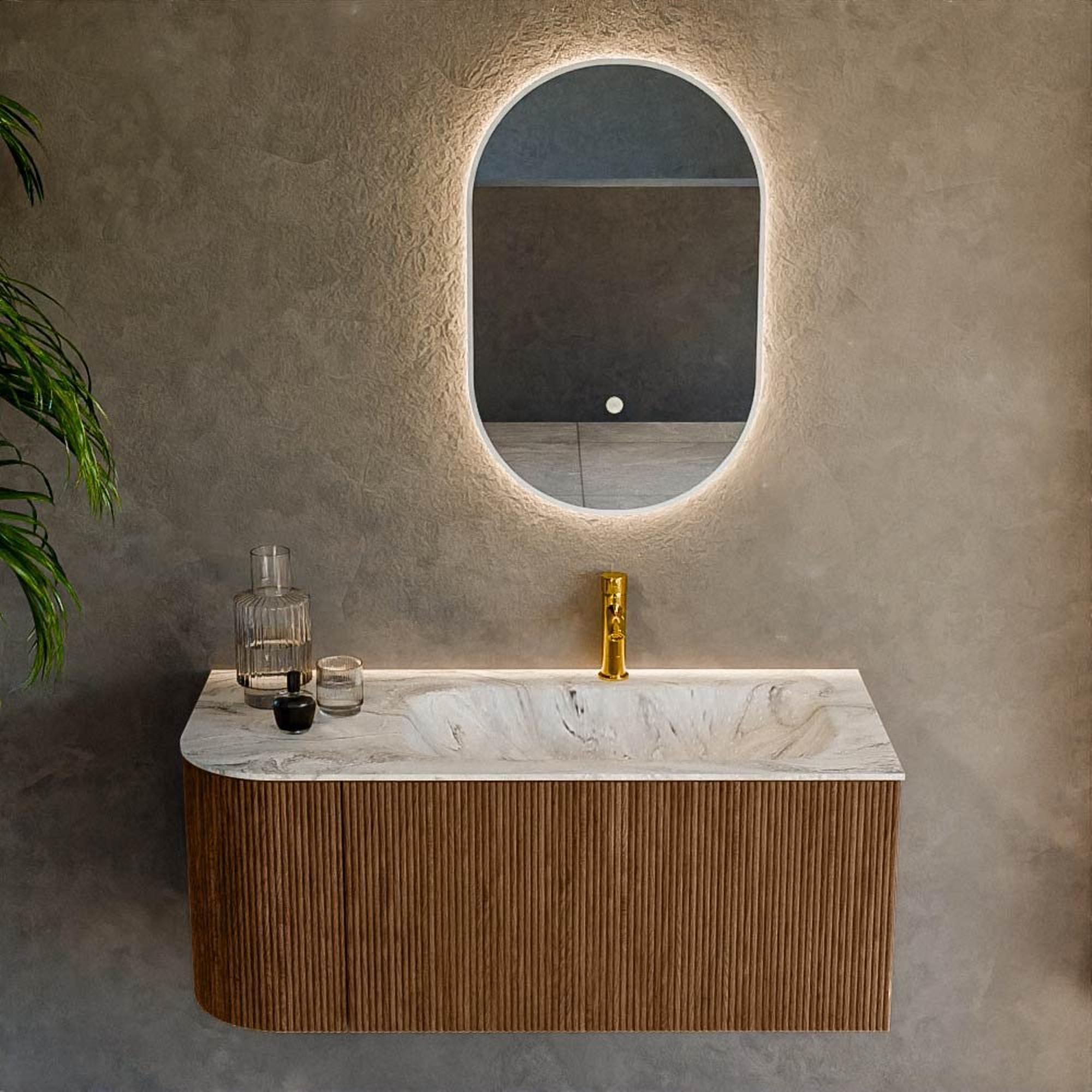 Het ultieme badmeubel dat je badkamer transformeert tot een oase van verfijning. Met zijn halfronde, verticale stroken van massief eiken, verkrijgbaar in de kleuren Oak en Walnut, straalt KURVE vakmanschap uit in elk detail. De zachte rondingen en slim ontworpen deurtjes, elk 40cm hoog, nodigen uit tot gebruik, terwijl de ruimte binnenin optimaal benut wordt dankzij de royale lade van dezelfde hoogte.