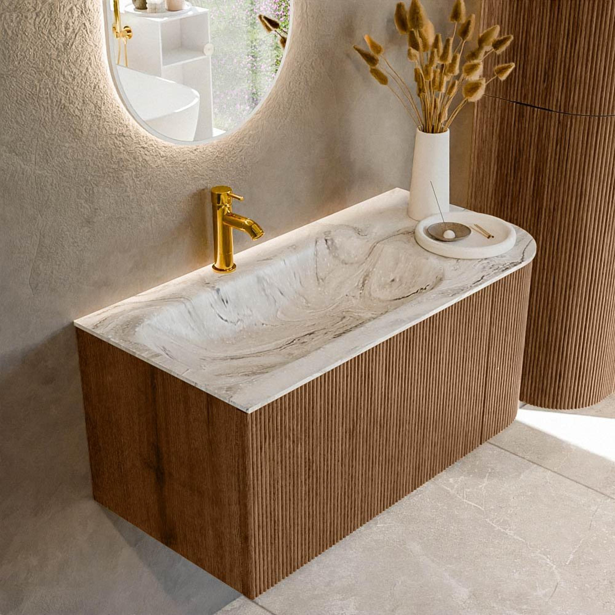 Het ultieme badmeubel dat je badkamer transformeert tot een oase van verfijning. Met zijn halfronde, verticale stroken van massief eiken, verkrijgbaar in de kleuren Oak en Walnut, straalt KURVE vakmanschap uit in elk detail. De zachte rondingen en slim ontworpen deurtjes, elk 40cm hoog, nodigen uit tot gebruik, terwijl de ruimte binnenin optimaal benut wordt dankzij de royale lade van dezelfde hoogte.