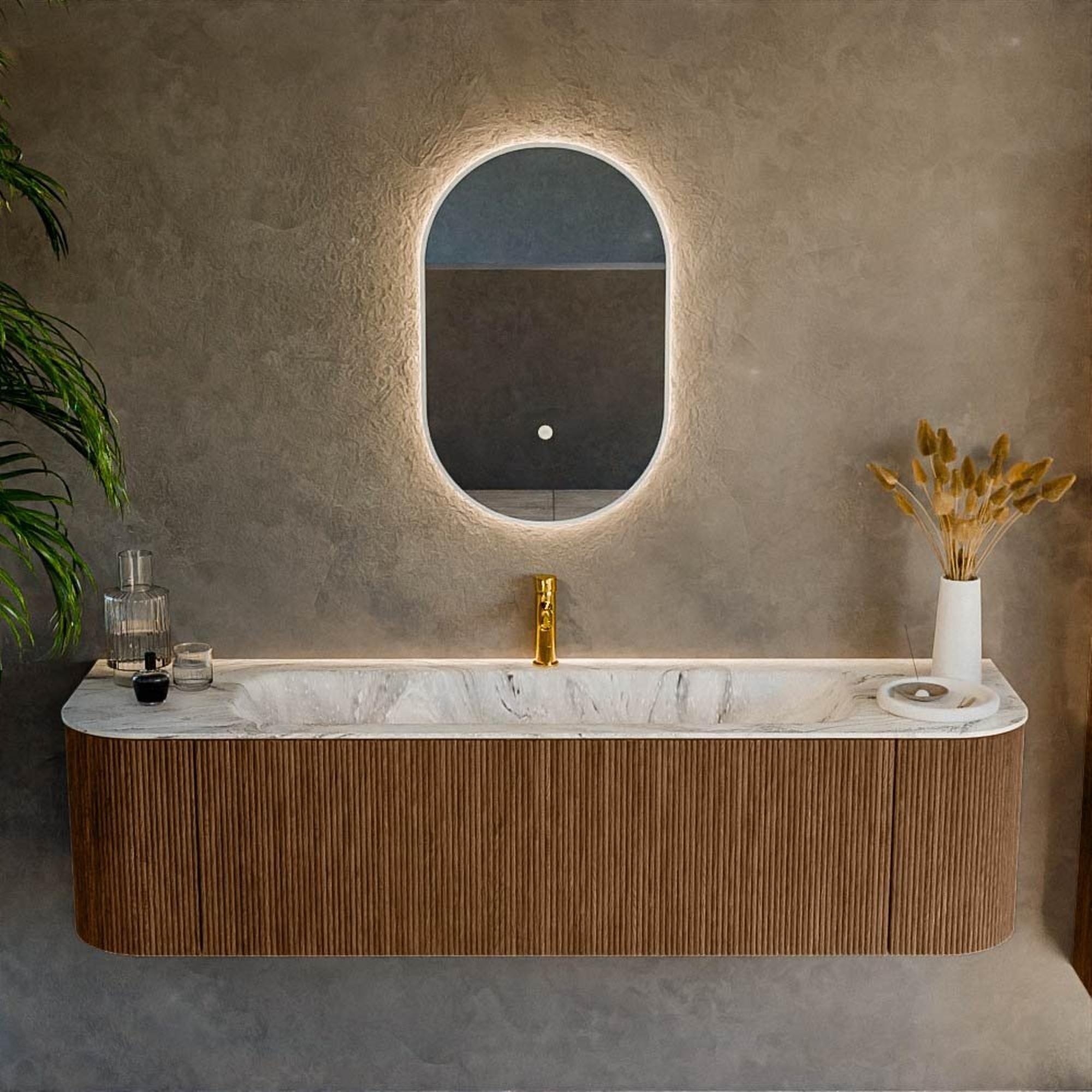 Het ultieme badmeubel dat je badkamer transformeert tot een oase van verfijning. Met zijn halfronde, verticale stroken van massief eiken, verkrijgbaar in de kleuren Oak en Walnut, straalt KURVE vakmanschap uit in elk detail. De zachte rondingen en slim ontworpen deurtjes, elk 40cm hoog, nodigen uit tot gebruik, terwijl de ruimte binnenin optimaal benut wordt dankzij de royale lade van dezelfde hoogte.